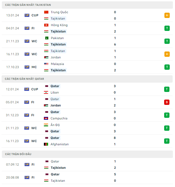 Phong độ, lịch sử đối đầu Tajikistan vs Qatar