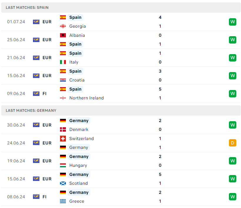 Tây Ban Nha có đầy đủ lực lượng mạnh nhất và HLV De la Fuente dự kiến sẽ giữ nguyên đội hình xuất phát. Ở hướng ngược lại, Đức chào đón sự trở lại của trung vệ Jonathan Tah sau án treo giò. HLV Nagelsmann có thể xoay vòng một số vị trí sau khi loại Maximilian Mittelstadt và Florian Wirtz ở trận đấu với Đan Mạch.