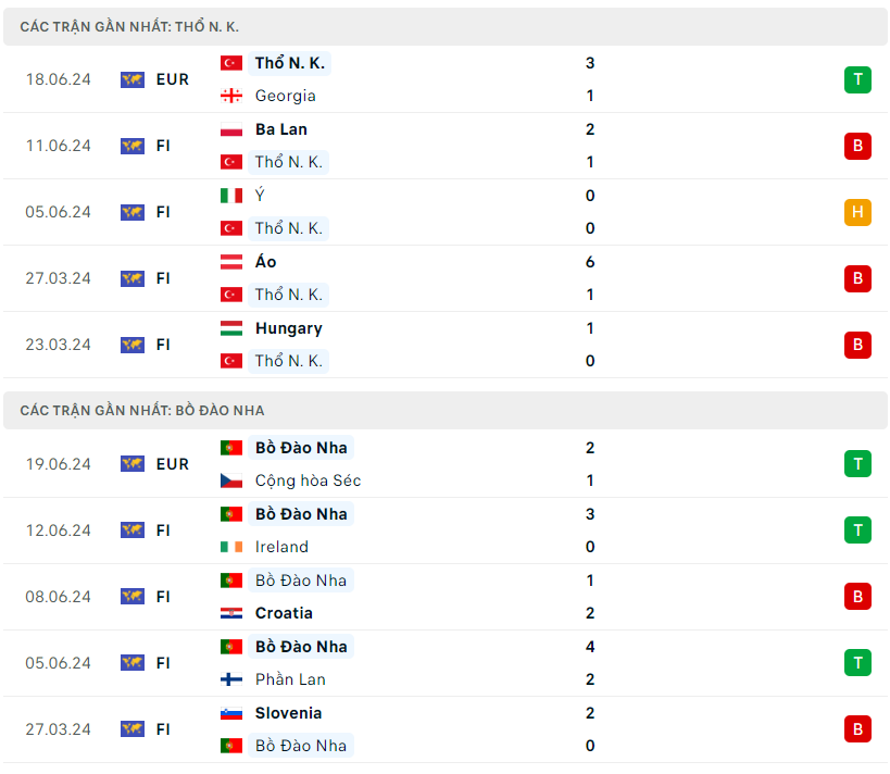Thông tin lực lượng Thổ Nhĩ Kỳ vs Bồ Đào Nha