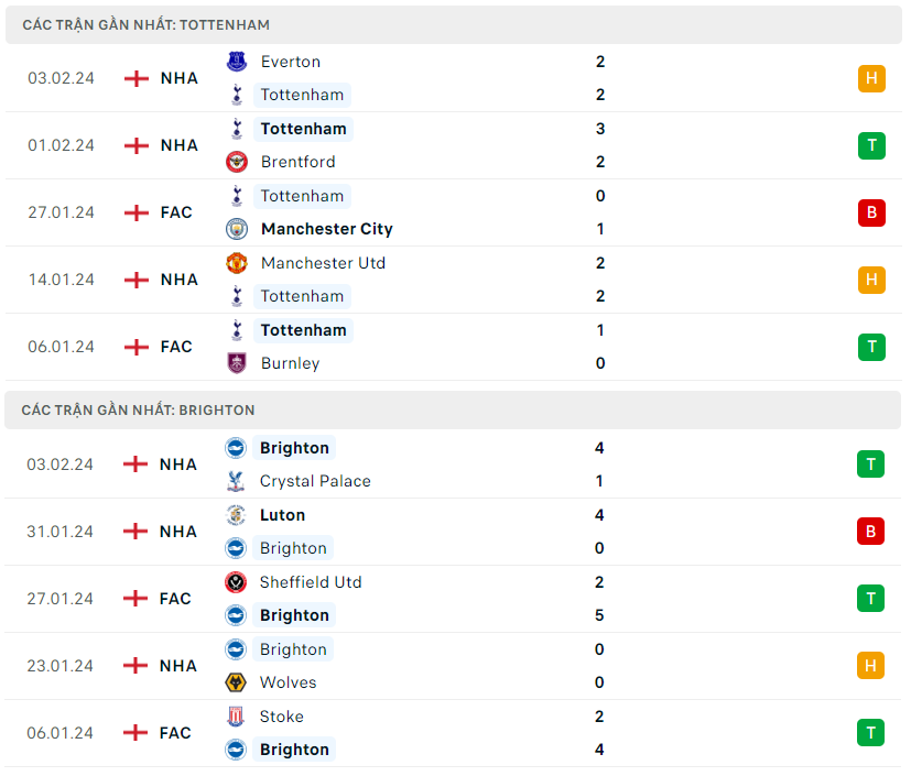 Lịch sử đối đầu, phong độ Tottenham vs Brighton