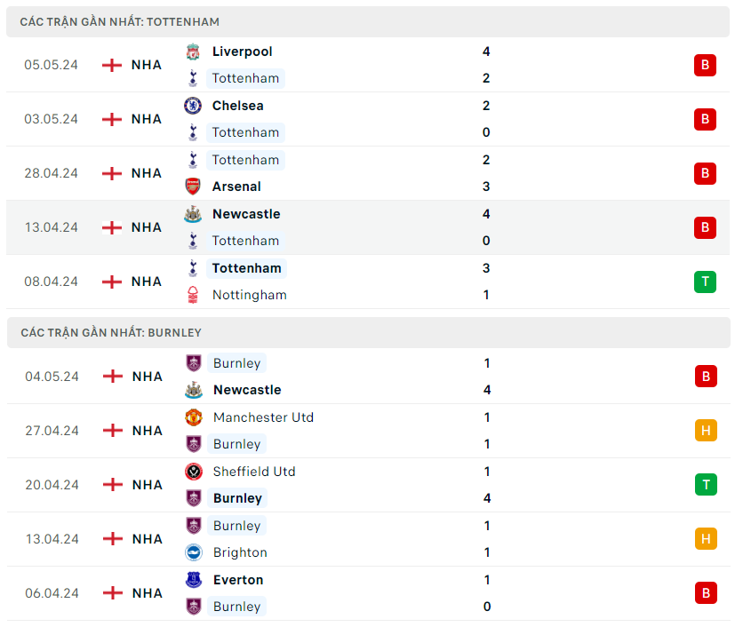 Burnley chỉ thua 2 trong 9 trận gần nhất (thắng 2, hòa 5). Đó là thành tích rất tốt với một đội bóng ở nhóm “cầm đèn đỏ”, nhưng nó không đủ giúp họ thắp lên hy vọng sống sót. Làm khách của Tottenham, Burnley buộc phải thắng và dâng cao tấn công. Khi đó, họ sẽ trở lại với hình ảnh cũ và dễ thua đậm - giống như trước Newcastle tuần qua.