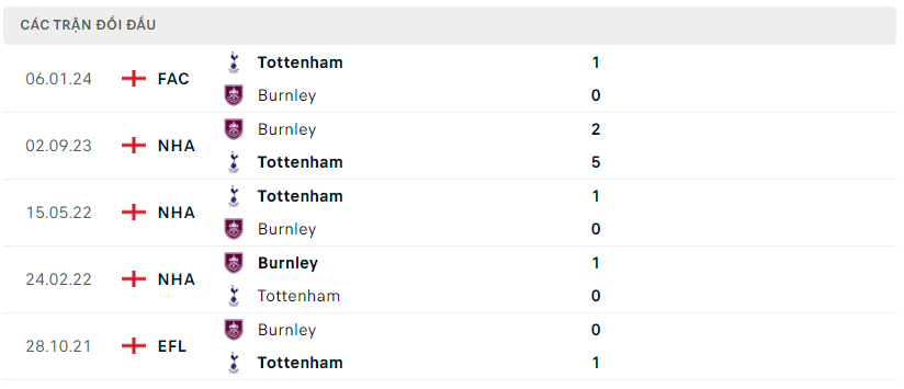 Lịch sử đối đầu, phong độ Tottenham vs Burnley