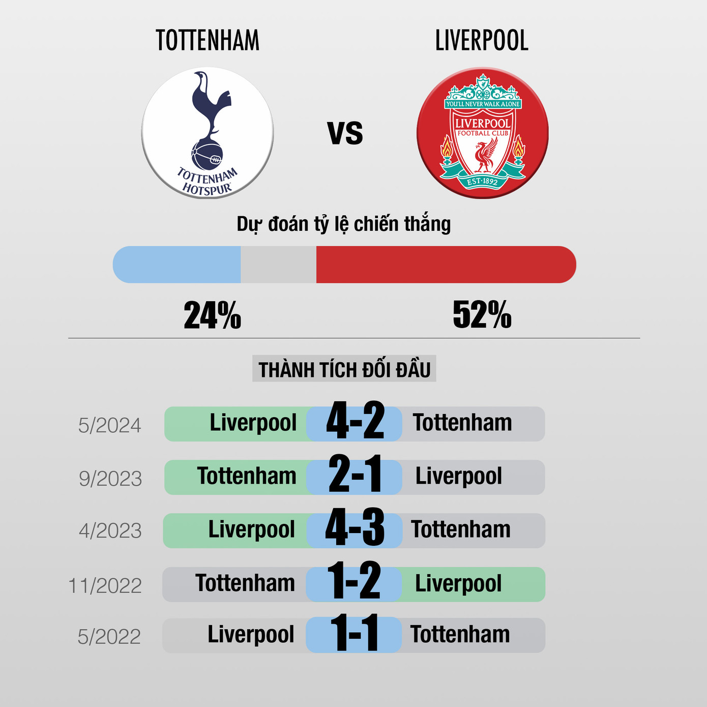 Hai vòng gần nhất ở Premier League, Liverpool bị Fulham và Newcastle cầm hòa. Từ thế thượng phong cho cuộc đua vô địch, "The Kop" bị Chelsea thu hẹp cách biệt xuống còn 2 điểm, chơi ít hơn đối thủ một trận. Thắng Tottenham là mục tiêu bắt buộc của thầy trò Arne Slot, vì nếu sẩy chân thêm một trận, chặng đường phía trước của Liverpool sẽ khó lường.