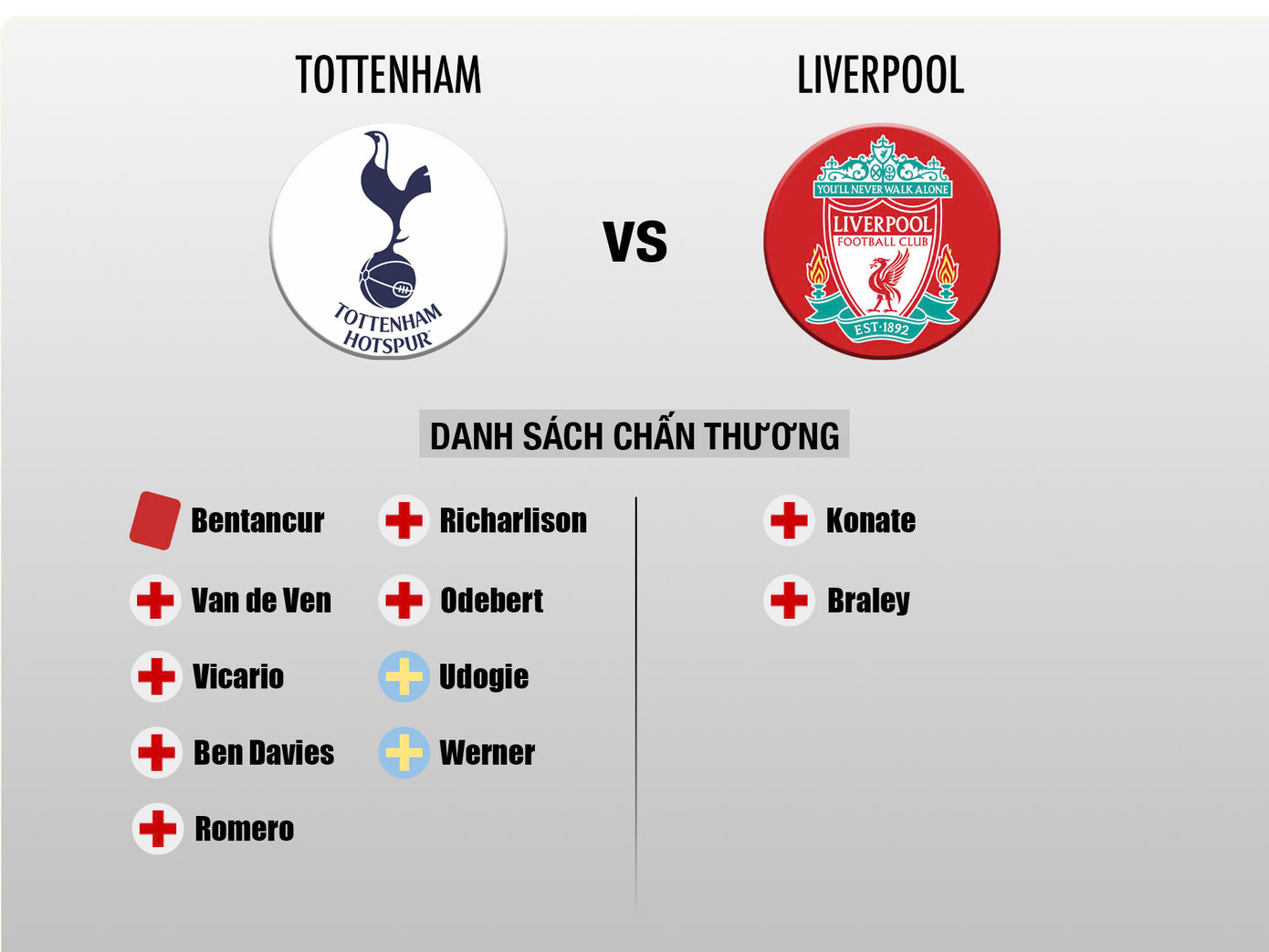 Đội hình Tottenham sứt mẻ nghiêm trọng vì án treo giò và chấn thương. Ngược lại, Liverpool chỉ có ca chấn thương của Konate là đáng chú ý. Song, kể cả khi không có Konate, "The Kop" vẫn còn phương án thay thế xứng đáng.