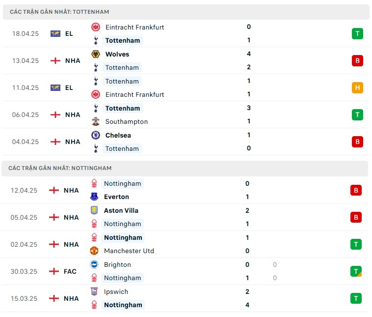 Lịch sử đối đầu, phong độ Tottenham vs Nottingham