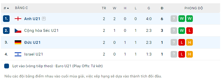 Các kết quả này giúp U21 Anh độc chiếm ngôi đầu bảng C, đồng thời chắc chắn giành vé vào tứ kết với ngôi đầu bảng trước 1 trận đấu. Cuộc so tài với U21 Đức tối nay chỉ mang ý nghĩa thủ tục với đội bóng của HLV Lee Carsley.