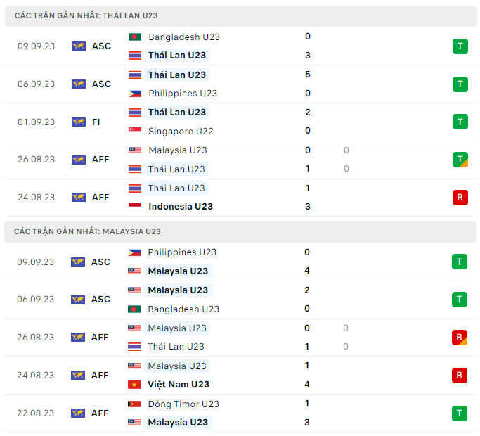 Phong độ, lịch sử đối đầu U23 Thái Lan vs U23 Malaysia