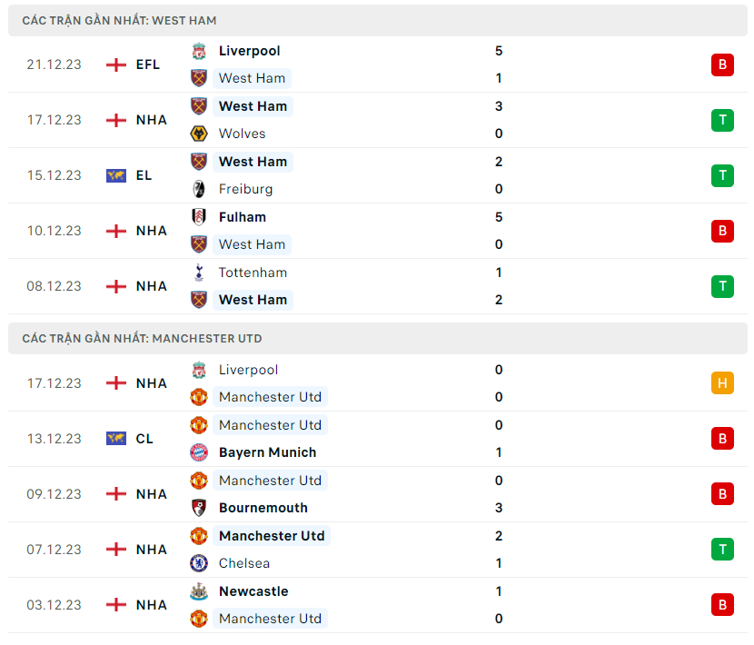 Lịch sử đối đầu, phong độ West Ham vs MU