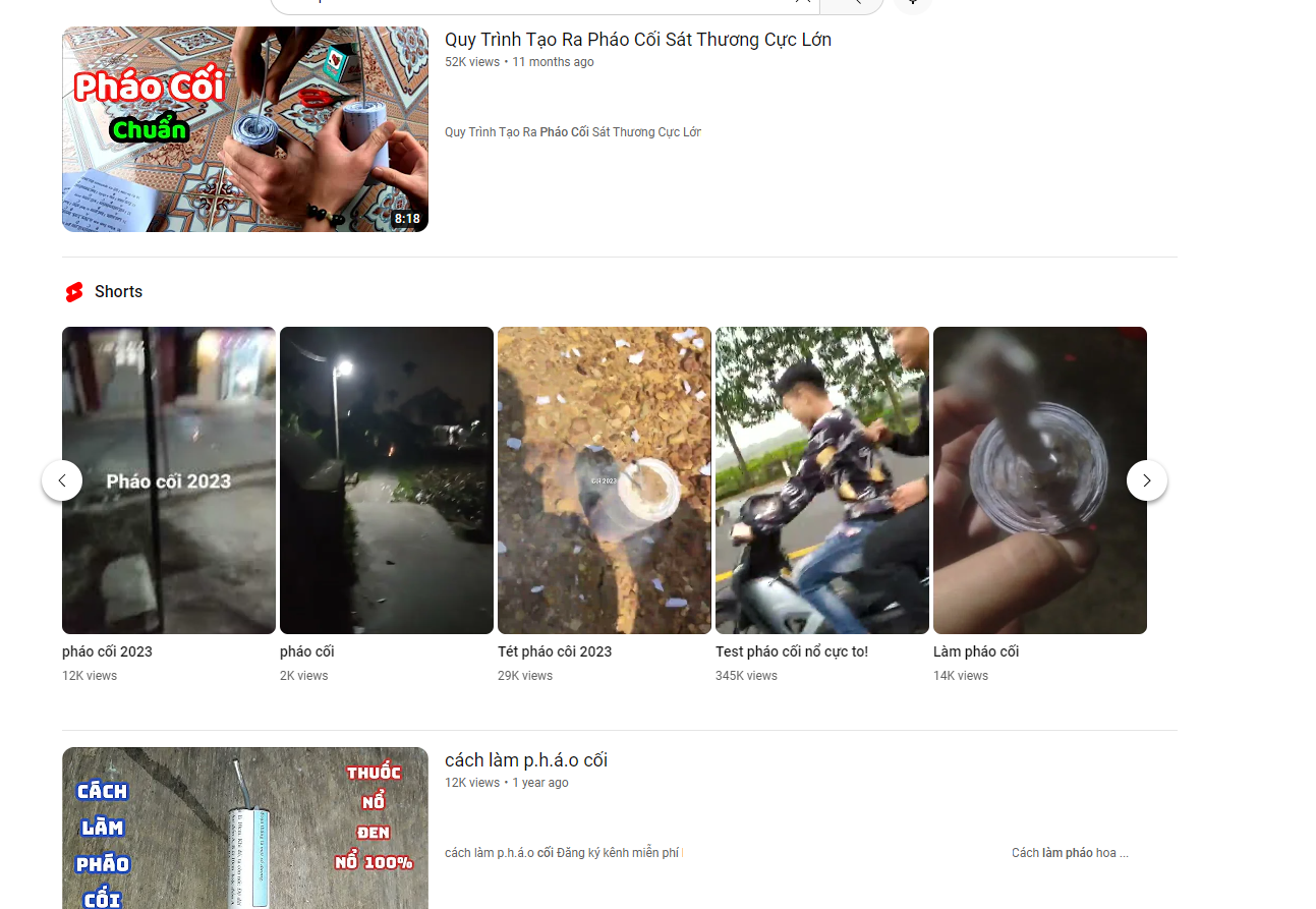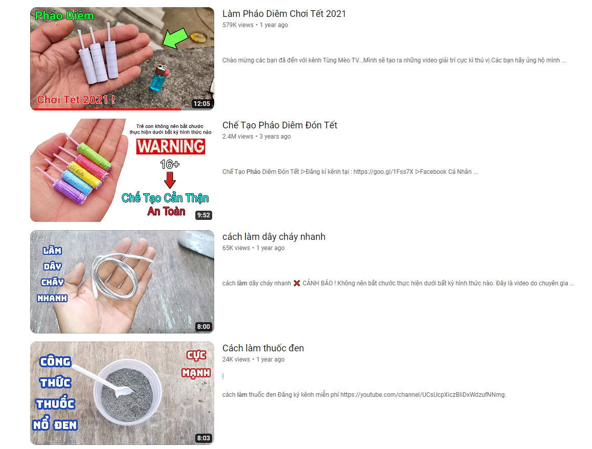 Không khó để tìm các video dạy cách chế pháo, thuốc nổ tại nhà. Chỉ cần gõ từ khóa "cách làm pháo" hoặc "làm pháo", hàng loạt video hướng dẫn cách làm các loại pháo khác nhau được đề xuất, phổ biến là pháo diêm - loại pháo được làm từ đầu diêm nghiền mịn, nén chặt trong cuộn giấy.