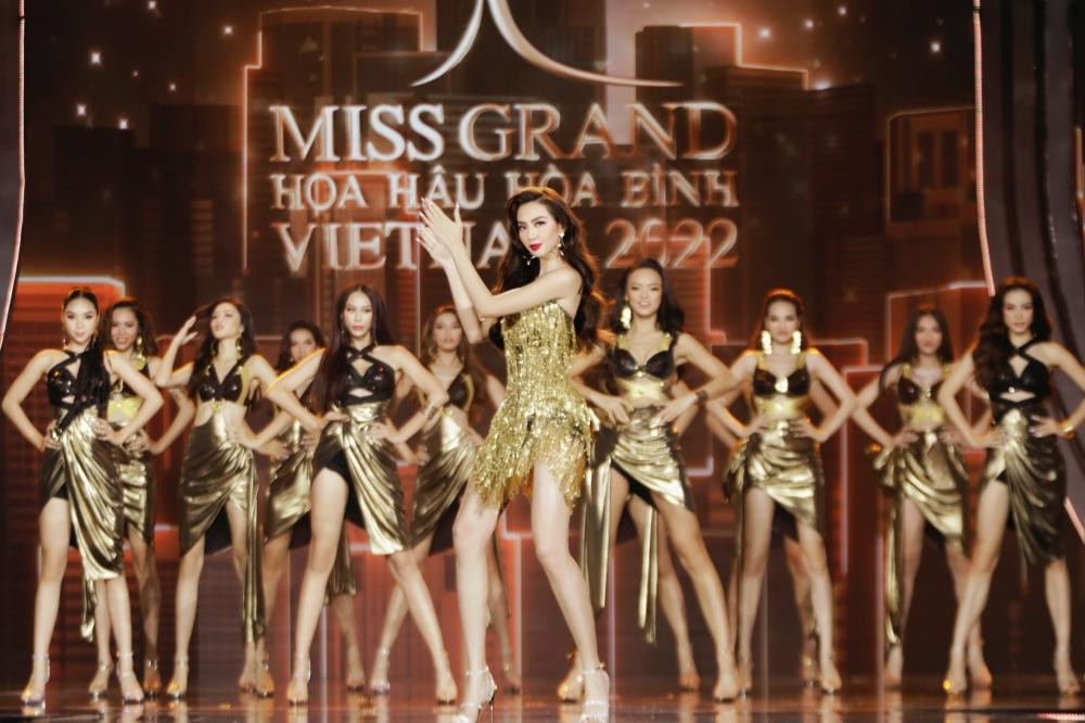 Sau đó, theo sát format cuộc thi quốc tế, Miss Grand Vietnam 2022 mở màn bằng phần trình diễn của Top 50. Hoa hậu Thùy Tiên cũng xuất hiện trong phần mở màn này.