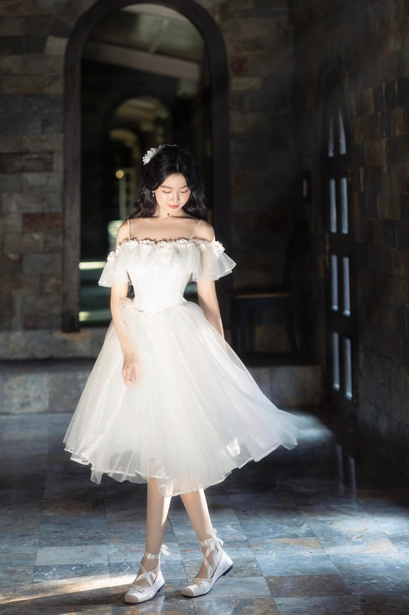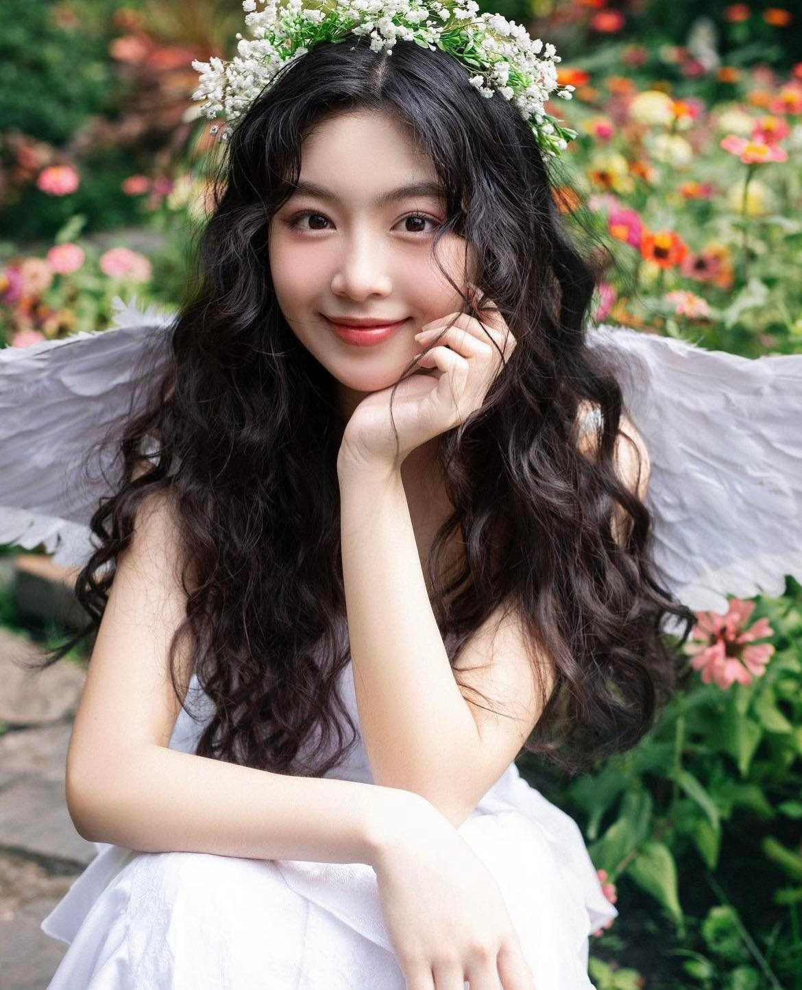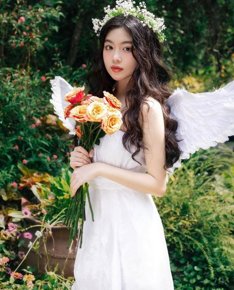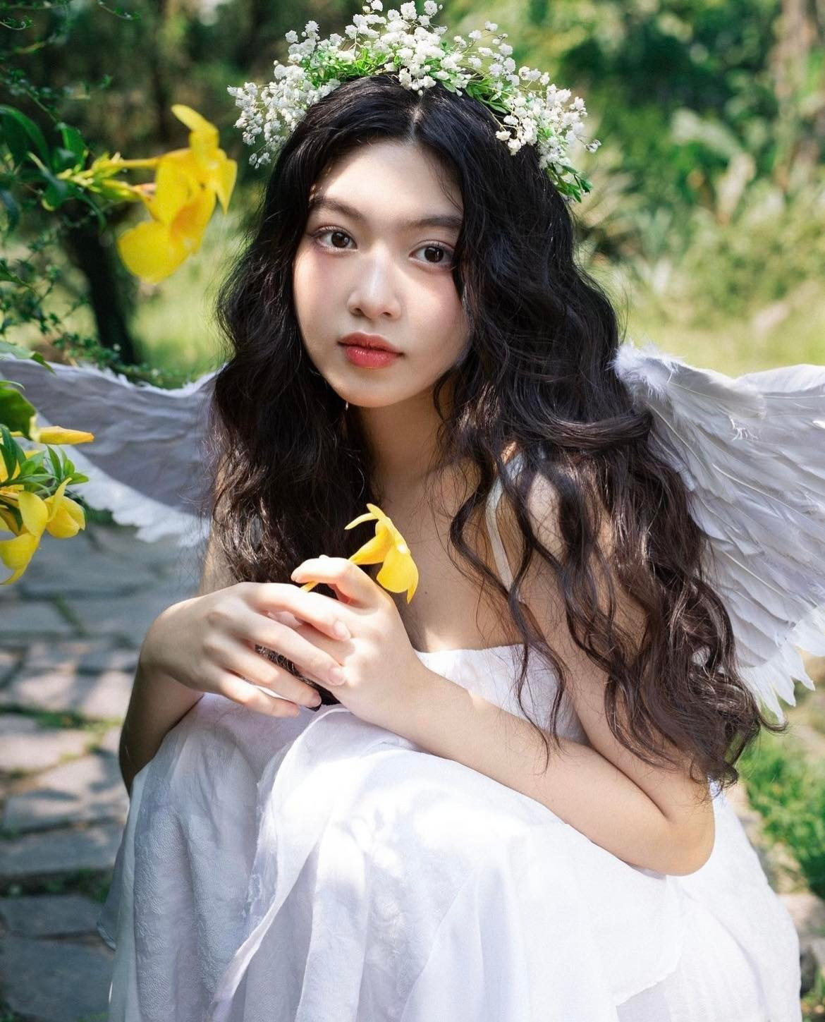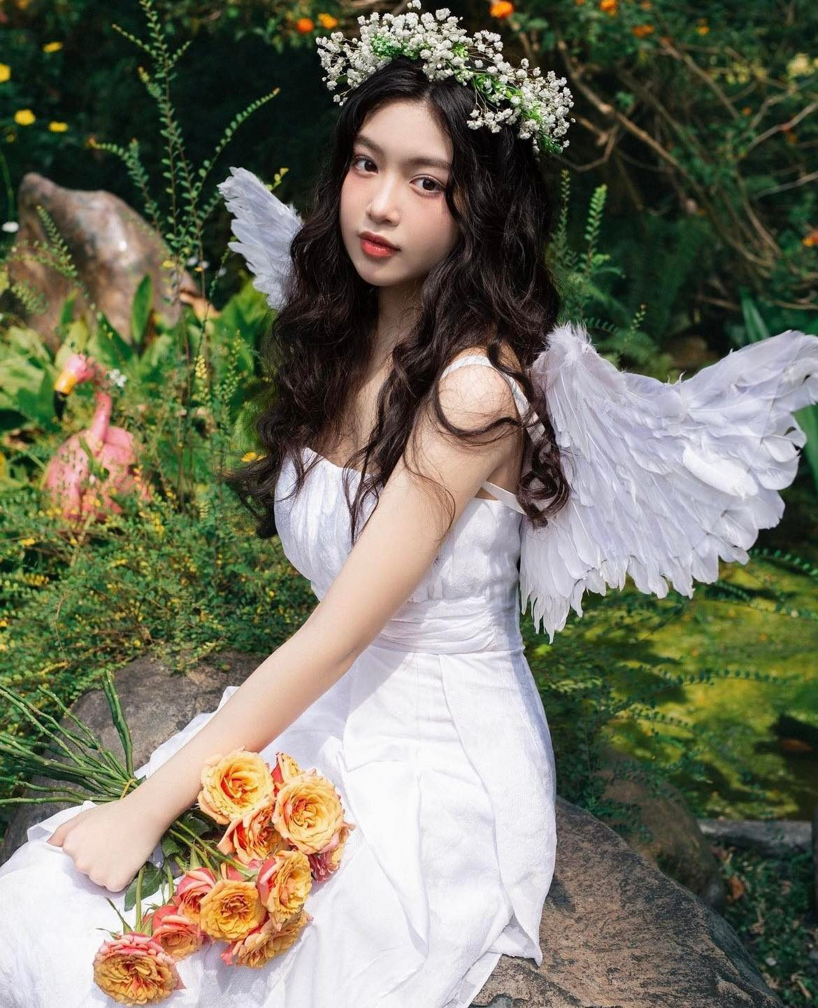 Trong bộ ảnh kỷ niệm sinh nhật 17 tuổi, Lọ Lem lại chọn hình tượng thiên thần với bộ váy trắng, đeo đôi cánh trắng nhỏ xinh và đội vòng hoa trên tóc. Không cần trang điểm cầu kỳ, Lọ Lem vẫn khoe được gương mặt hài hòa xinh như búp bê.