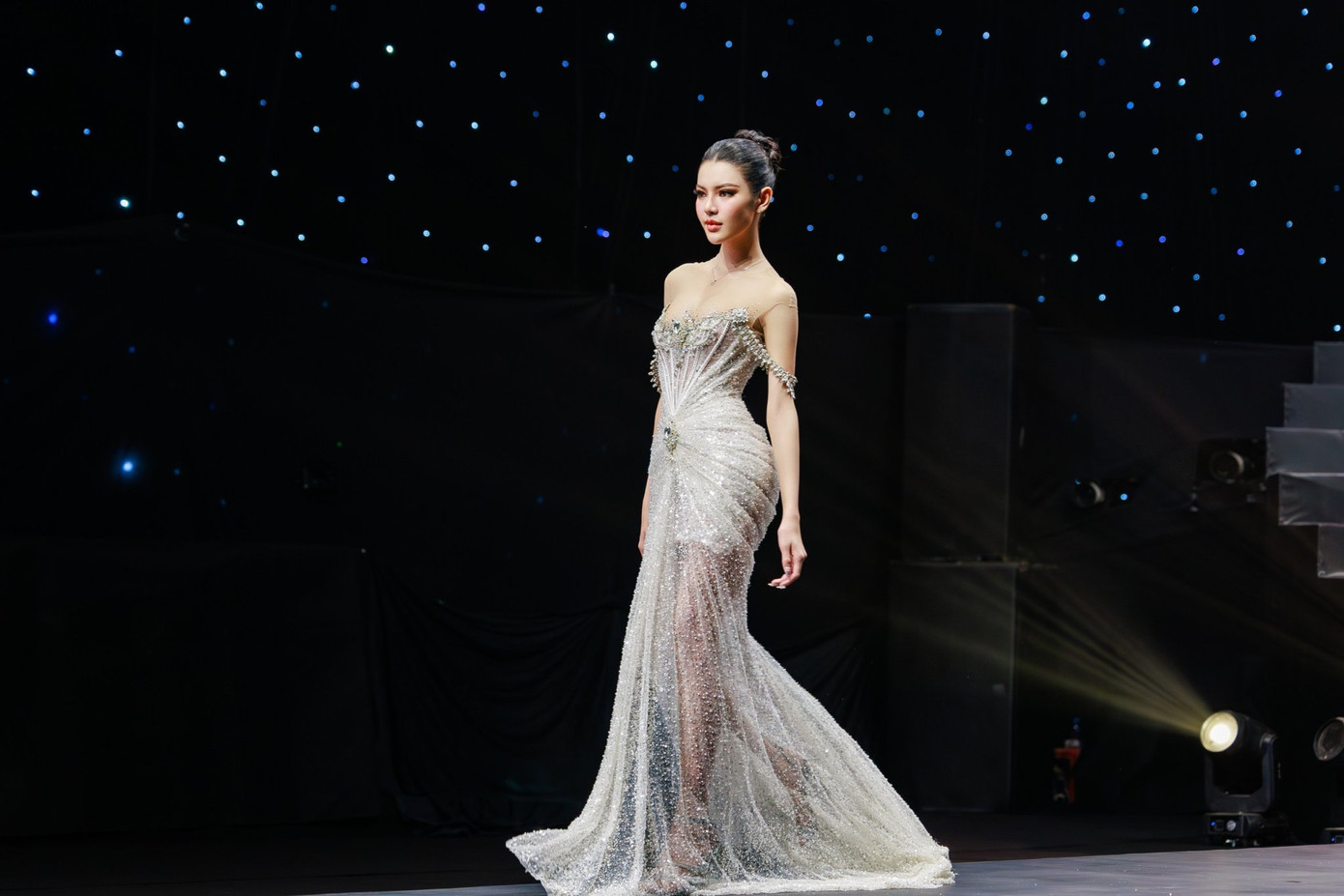 Khi diện trang phục dạ hội, Tường San khoe trọn hình thể “đồng hồ cát” của mình. Có thể thấy, với vẻ ngoài và thần thái đầy quyến rũ, đại diện Việt Nam tại ‘đấu trường’ sắc đẹp này sẽ tiếp tục là đối thủ đáng gờm của các thí sinh quốc tế khác.