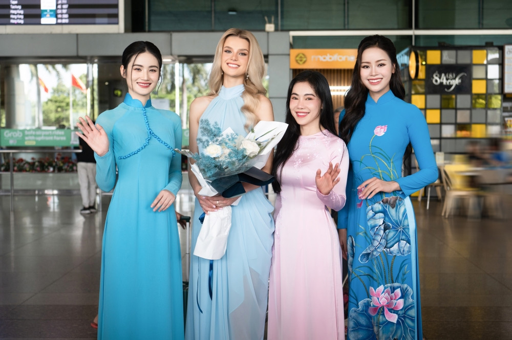 Hoa hậu Huỳnh Trần Ý Nhi, Á hậu Đào Thị Hiền diện áo dài truyền thống màu xanh, CEO Phạm Kim Dung diện áo dài màu hồng, đây là các gam màu đặc trưng của Miss World ra đón hoa hậu.