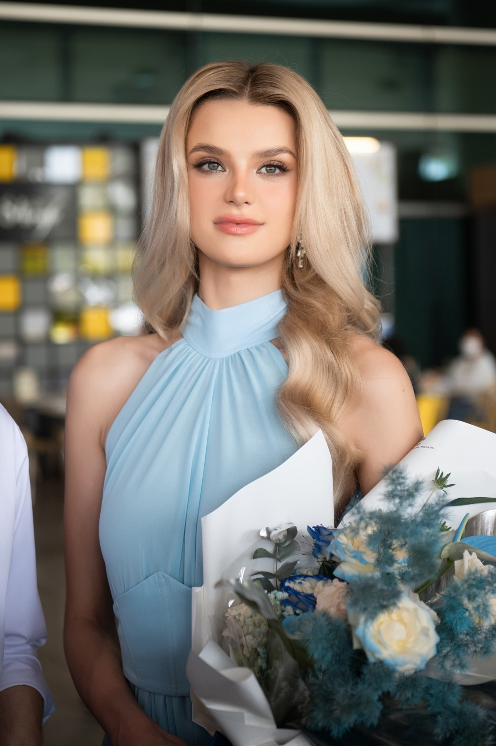 Không hẹn mà gặp, đương kim Miss World 2024 cũng diện bộ váy màu xanh, mái tóc vàng đặc trưng, xinh đẹp như công chúa phim Disney. “Tôi rất ấn tượng bởi văn hóa Việt Nam, phong phú với nhiều cảnh đẹp. Tôi rất mong muốn được thưởng thức món phở khi sang đây.” - Krystina Pyszkova chia sẻ.