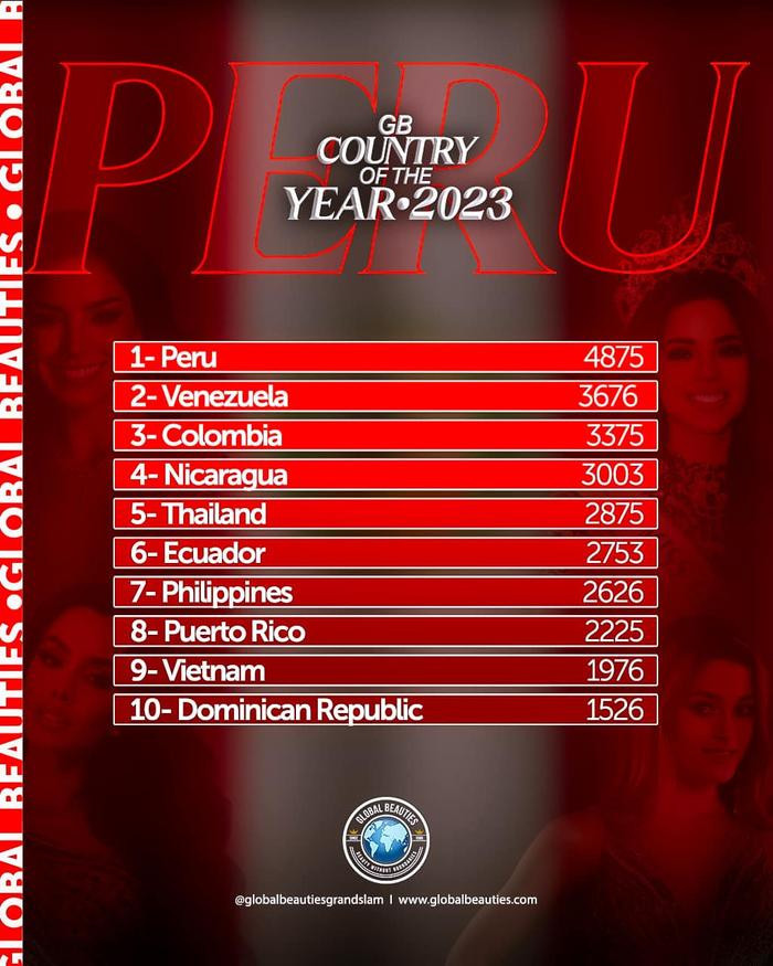 Theo tổng điểm được quy đổi từ các cuộc thi đã diễn ra (chưa có Miss World), Peru hiện đang giữ vị trí cao nhất với 4875 điểm, xếp thứ hai là Venezuela, thứ 3 là Colombia. Việt Nam đứng hạng thứ 9 với 1976 điểm.