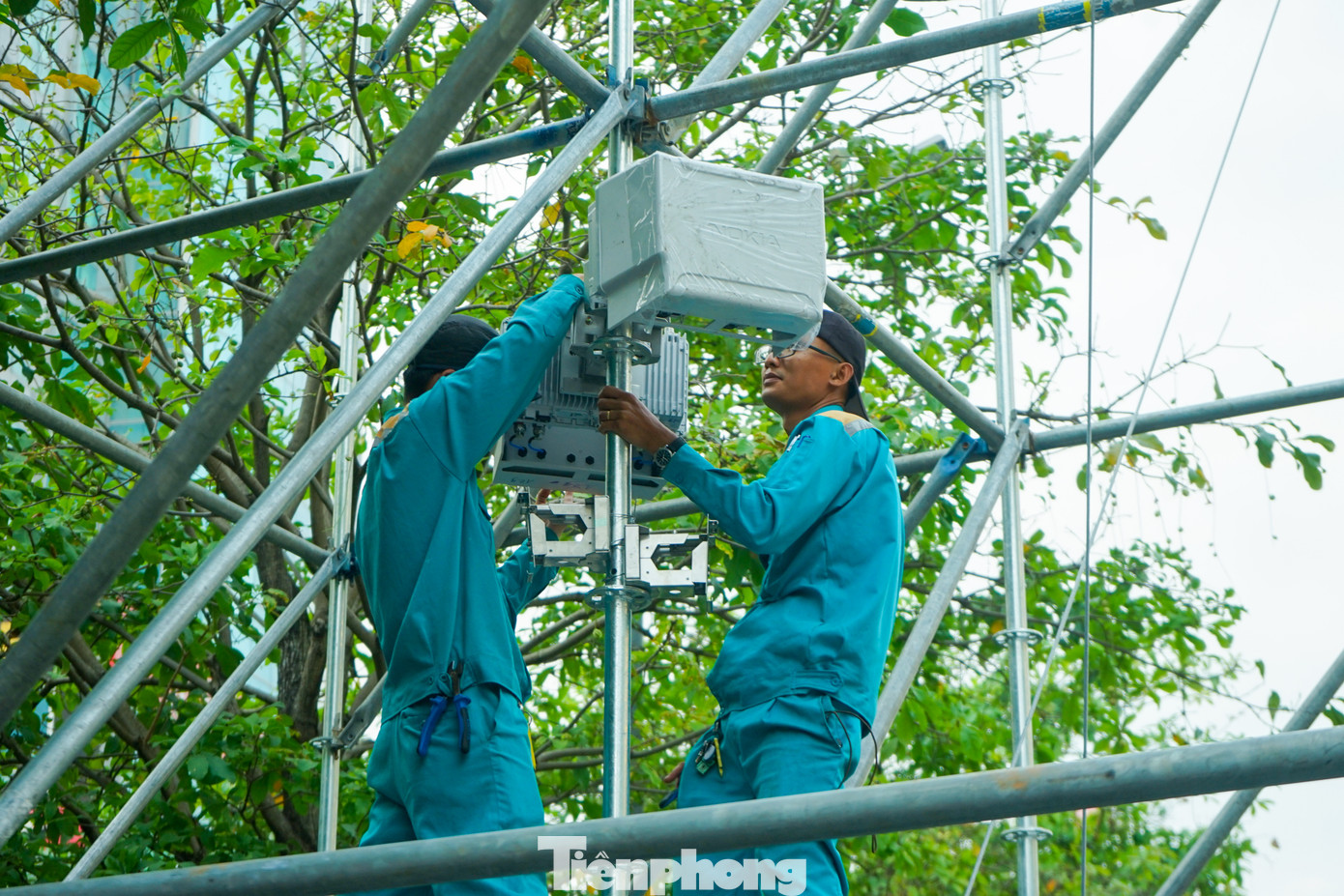 | Tại phố đi bộ Nguyễn Huệ, một số công nhân của chương trình đếm ngược chào đón năm mới 2023 cũng đã cơ bản dựng xong sân khấu và hệ thống âm thanh, ánh sáng cho sự kiện vào tối 31/12 tới đây |