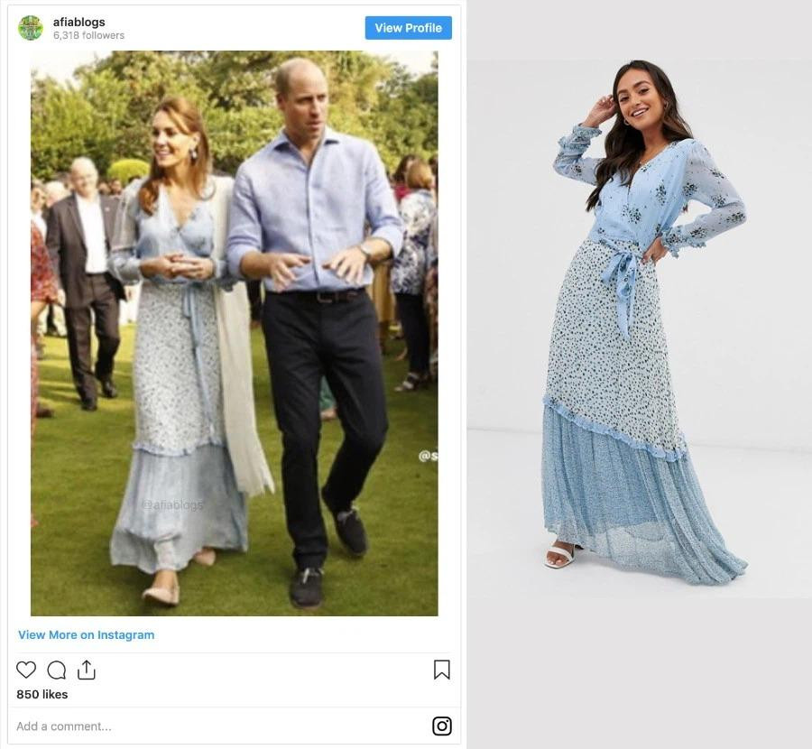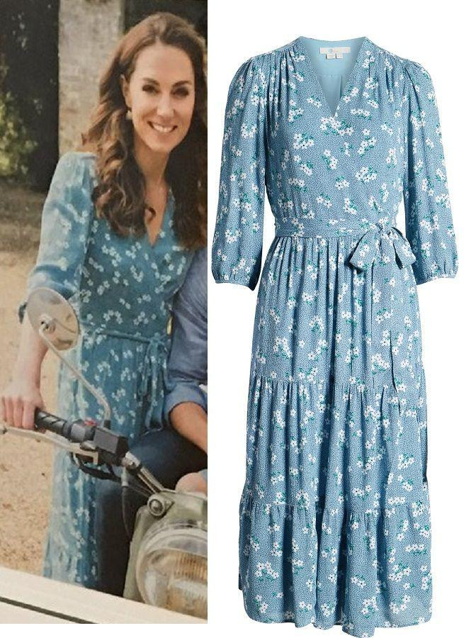 Chiếc váy voan nhẹ nhàng dài tay màu xanh điểm những bông hoa li ti rất hợp với phong cách của Công nương Kate, là kiểu trang phục mà cô diện nhiều nhất từ khi kết hôn với Hoàng tử William. Thật bất ngờ là trong dịp trọng đại như thế này, Công nương Kate vẫn chọn mặc váy cũ chứ không sắm sửa đồ mới.