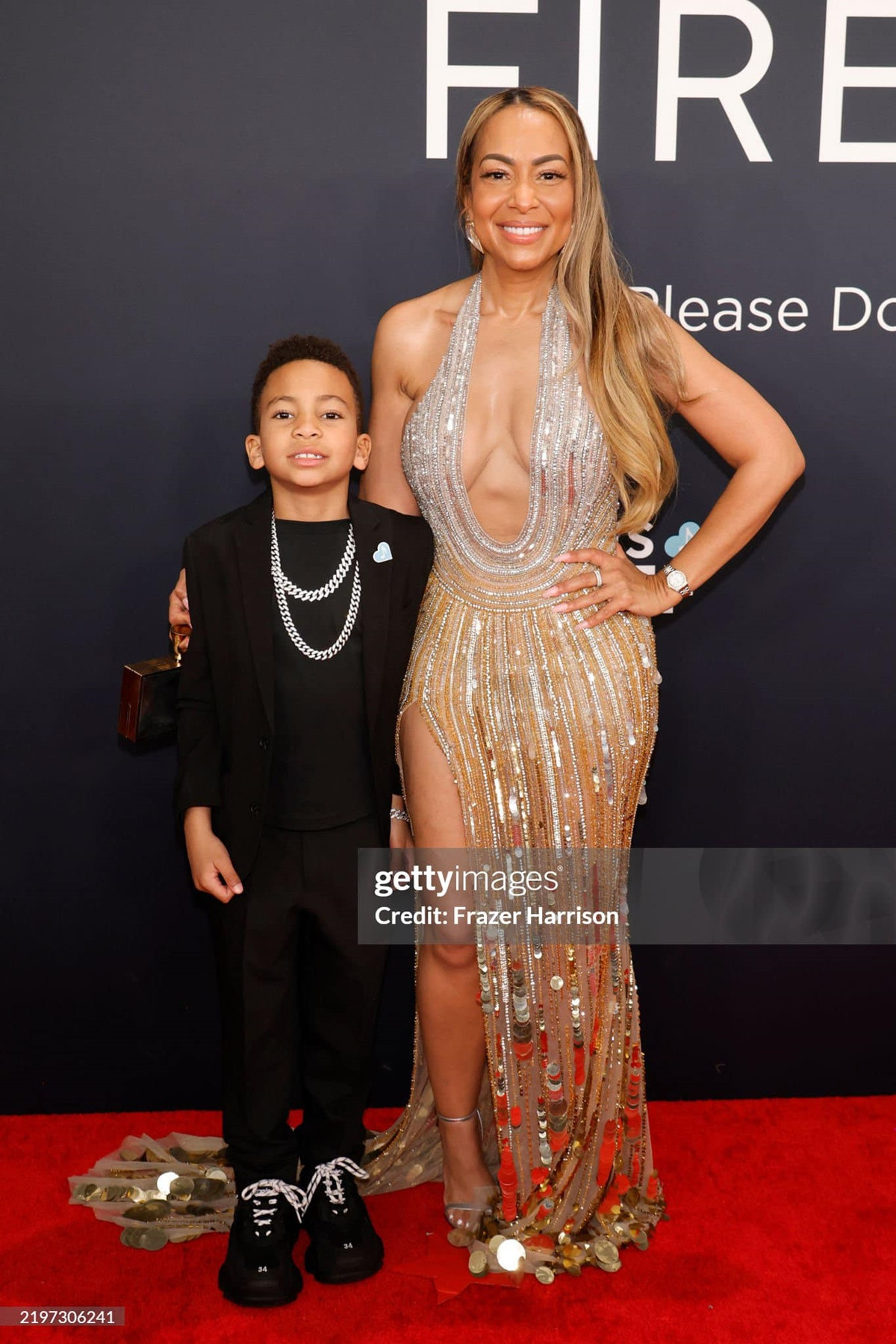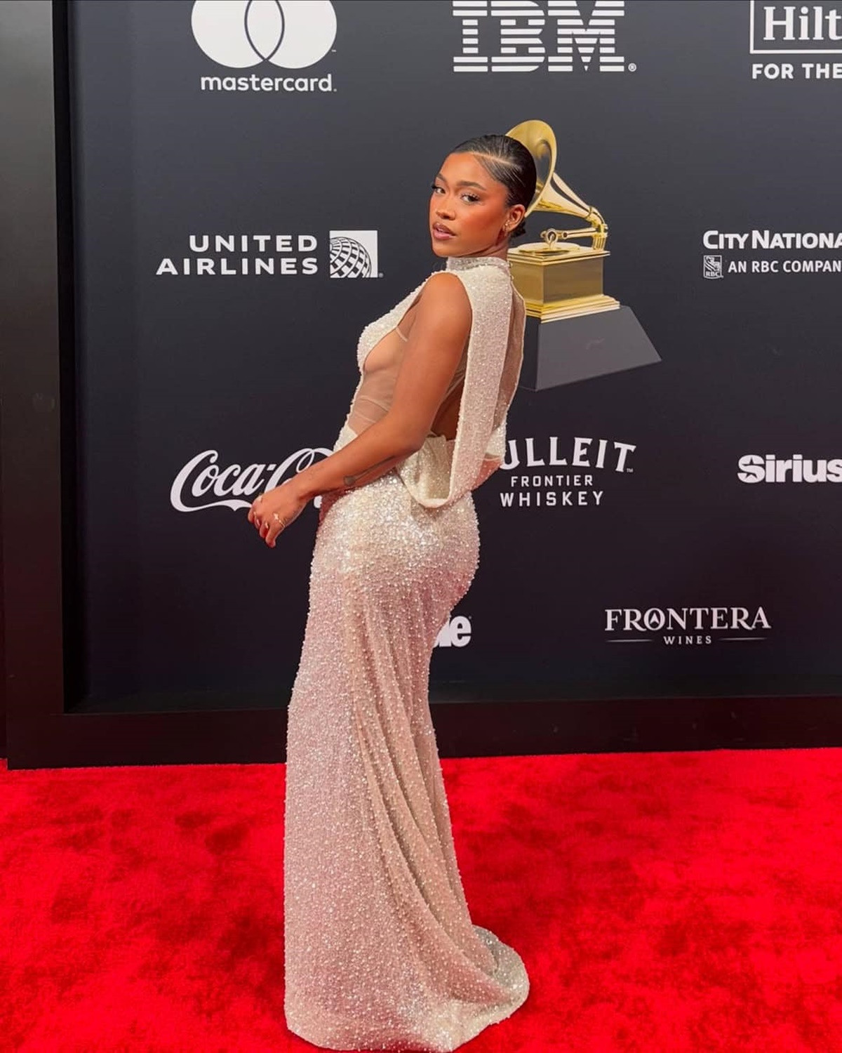 Đồng Chủ tịch giải thưởng Grammys - bà Valeisha Butterfield chọn thiết kế cổ V khoét sâu đính kết sequin lấp lánh của NTK Lê Thanh Hòa.
