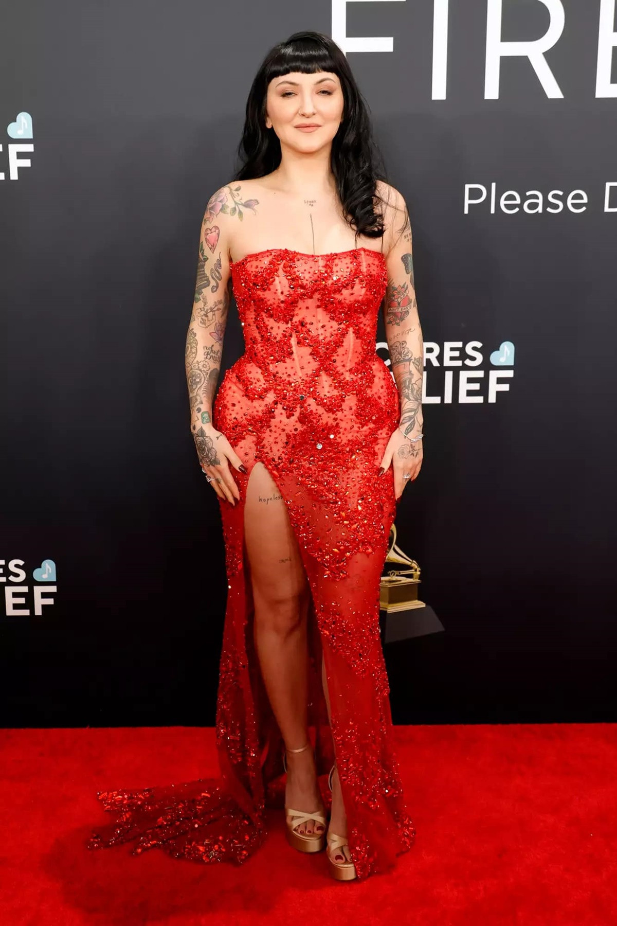 Olivia Rodrigo xuất hiện đầy cuốn hút trong thiết kế cắt xẻ táo bạo từ Versace, tôn lên vẻ đẹp trưởng thành và quyến rũ. Sự kết hợp giữa phong cách sang trọng và cá tính giúp nữ ca sĩ trở thành một trong những gương mặt nổi bật nhất trên thảm đỏ Grammys 2025.
