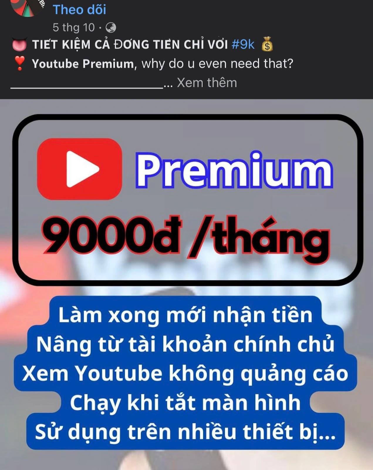 Tuy nhiên, thời gian gần đây đã xuất hiện rất nhiều các bài đăng được chạy quảng cáo trên một số nền tảng mạng xã hội như Facebook, Instagram... về dịch vụ đăng ký YouTube Premium với giá chỉ 9K mỗi tháng. Đây là một mức giá quá rẻ so với mức giá chính thức mà Google đưa ra. Chính vì vậy mà có rất nhiều người dùng Internet "ham của rẻ" đã sập bẫy của các đối tượng lừa đảo.