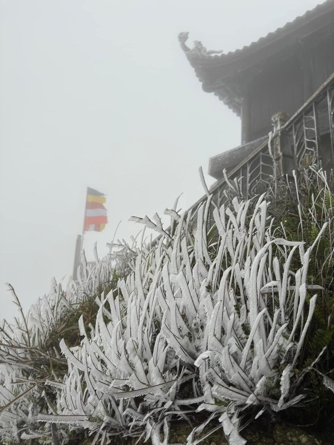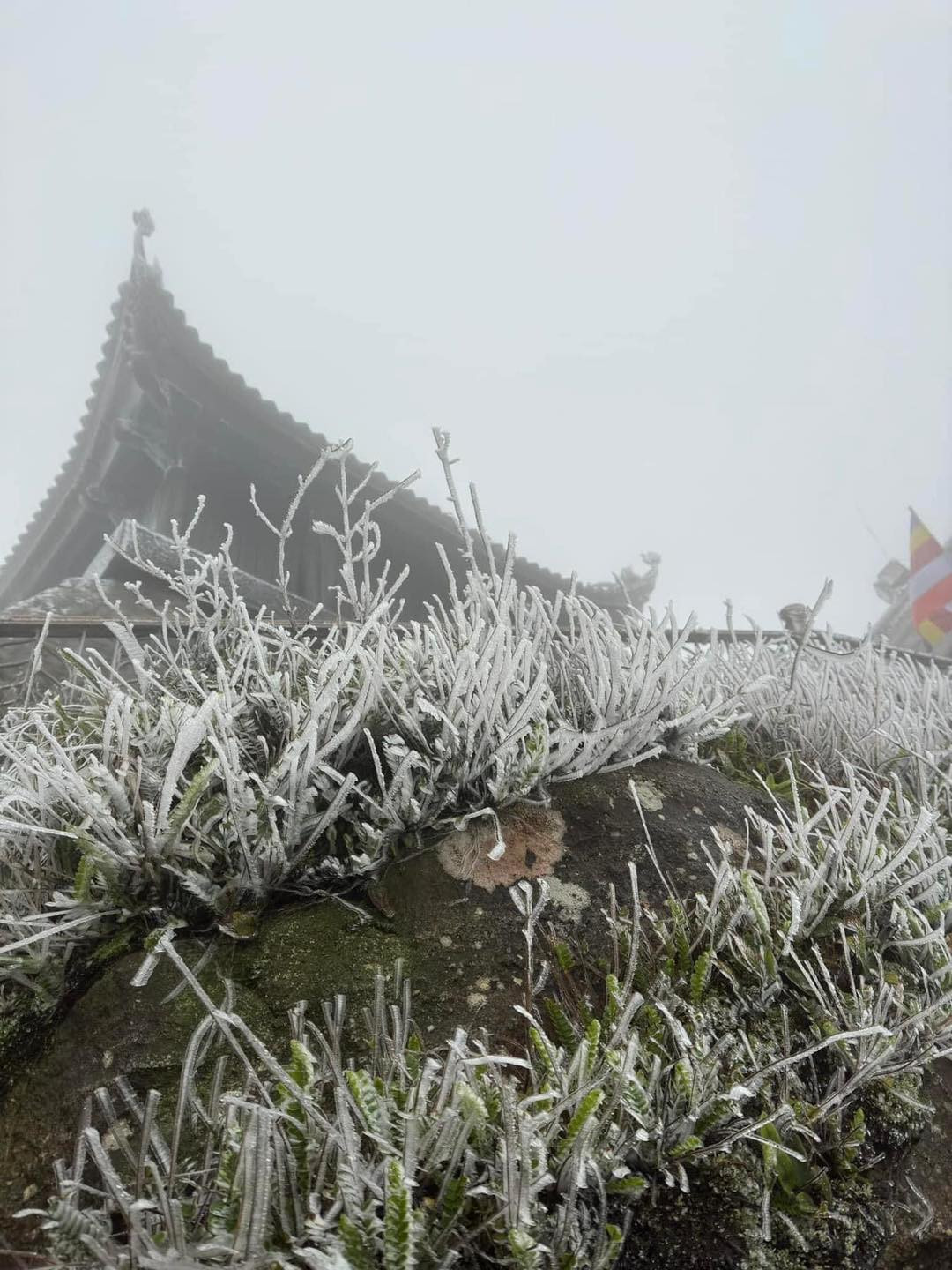 Tại đây, mái chùa, chuông và khánh cùng lan can trước chùa Đồng đều phủ lớp băng trắng. Ngoài ra, cây cối khu vực phía dưới cũng bị đóng băng. Lớp băng dày xuôi theo một hướng do gió kèm nước mưa thổi mạnh.