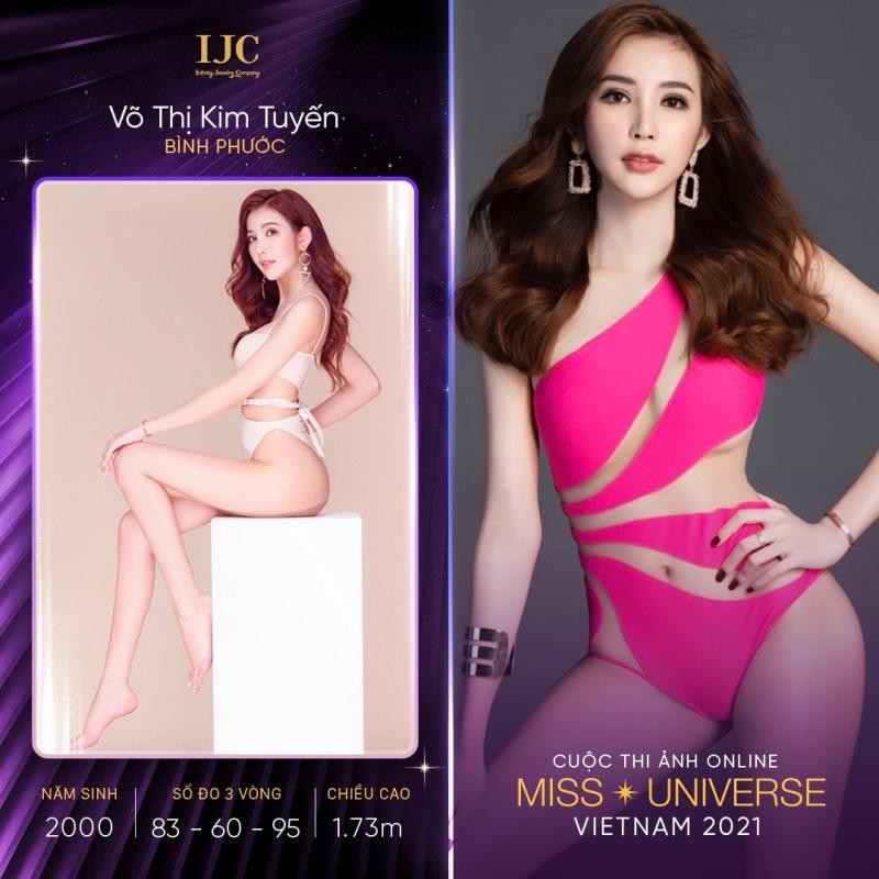 Đến từ Bình Phước, thí sinh Võ Thị Kim Tuyến chia sẻ đã dành nhiều thời gian cho việc trau dồi bản thân, không ngừng học tập để chinh phục Hoa hậu Hoàn vũ Việt Nam 2021, trước hết là cuộc thi ảnh online. Cô cao 1m73, số đo 83-60-95, sinh năm 2000.