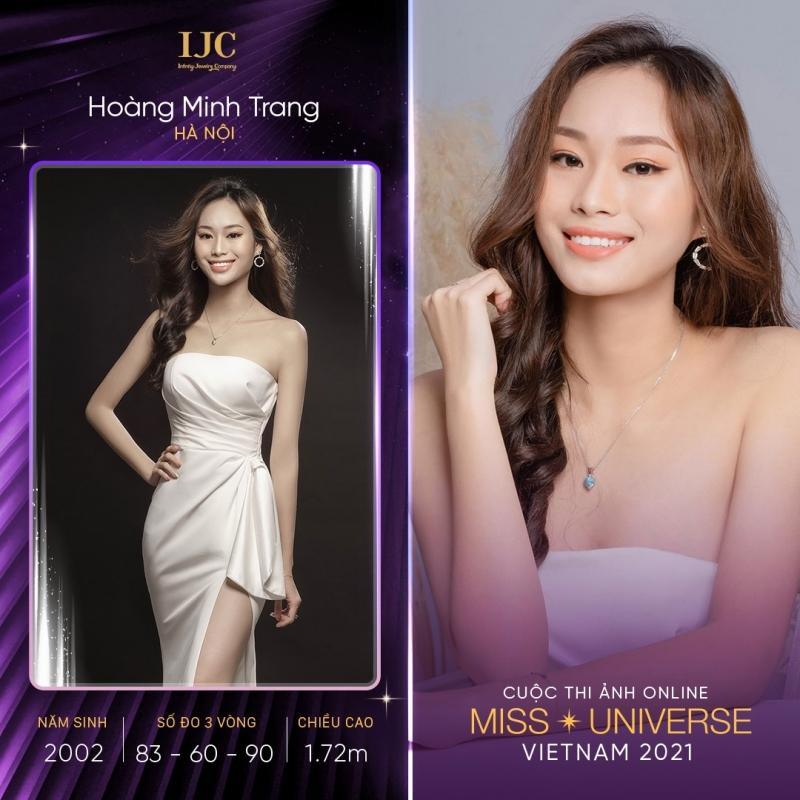 Sinh năm 2002, thí sinh Hoàng Minh Trang đến từ Hà Nội hiện đang là sinh viên trường Đại học Kinh tế Quốc dân Hà Nội. Theo đuổi ngành kinh doanh quốc tế, thế nhưng Minh Trang tiết lộ rằng các cuộc thi nhan sắc luôn có sự thu hút rất mãnh liệt đối cô. Minh Trang cao 1m72, số đo hình thể 83-60-90.
