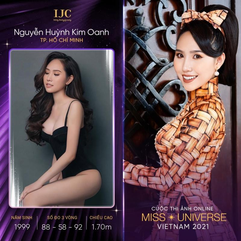 Thí sinh Nguyễn Huỳnh Kim Oanh sinh năm 1999 đang là sinh viên năm 4 đại học Hoa Sen, ngành Quản trị khách sạn. Kim Oanh cao 1m70, số đo hình thể 88-58-92.