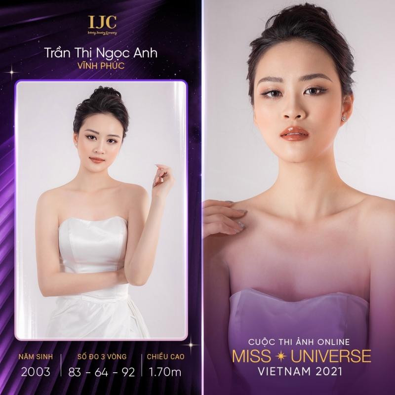 Thí sinh Trần Thị Ngoc Anh, sinh năm 2003, đến từ Vĩnh Phúc tâm sự rằng cô là một người vui tính, hoà đồng, luôn sống theo ước mơ của mình. Ngọc Anh cao 1m70, số đo hình thể 83-64-92.