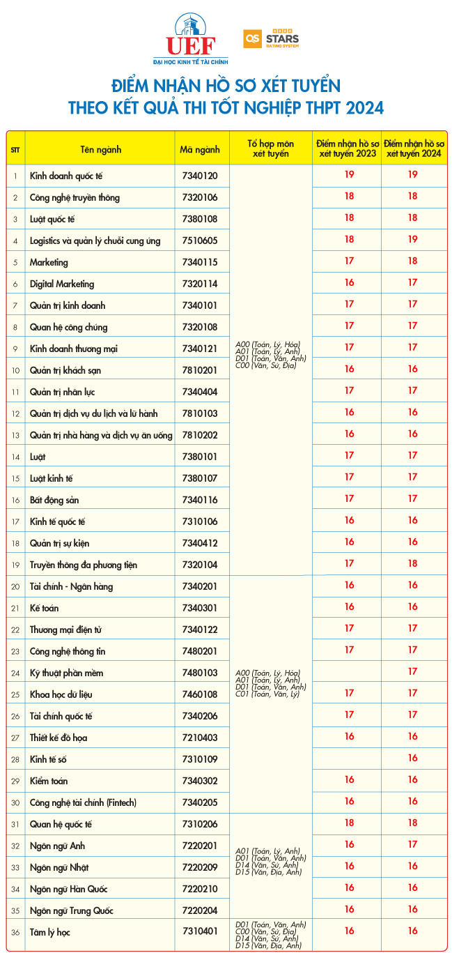 Cũng trong sáng 18/7, Hội đồng tuyển sinh trường ĐH Kinh tế - Tài chính TP. HCM (UEF) đã công bố mức điểm nhận hồ sơ xét tuyển của phương thức xét kết quả thi tốt nghiệp THPT 2024 ở 36 ngành đào tạo trình độ đại học.