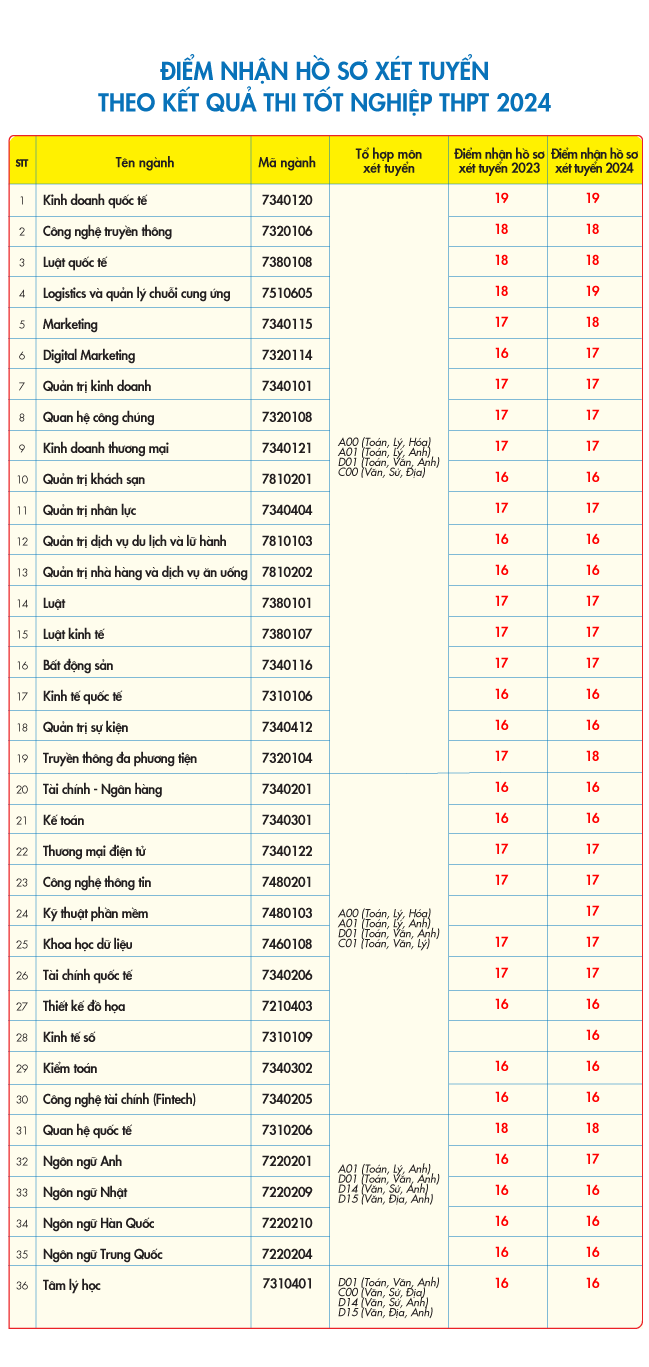 Theo đó, hai ngành có mức điểm nhận hồ sơ xét tuyển cao nhất là 19 là Logistics và quản lý chuỗi cung ứng, Kinh doanh quốc tế. Các ngành Luật quốc tế, Công nghệ truyền thông, Marketing, Truyền thông Đa phương tiện, Quan hệ quốc tế có mức điểm nhận hồ sơ là 18. Các ngành có điểm nhận hồ sơ 17 điểm gồm Quản trị Kinh doanh, Digital marketing, Kinh doanh Thương mại, Quan hệ công chúng, Quản trị Nhân lực, Luật Kinh tế, Luật, Bất động sản, Thương mại điện tử, Tài chính quốc tế, Công nghệ thông tin, Kỹ thuật Phần mềm, Khoa học Dữ liệu, Ngôn ngữ Anh. Các ngành còn lại là 16 điểm.