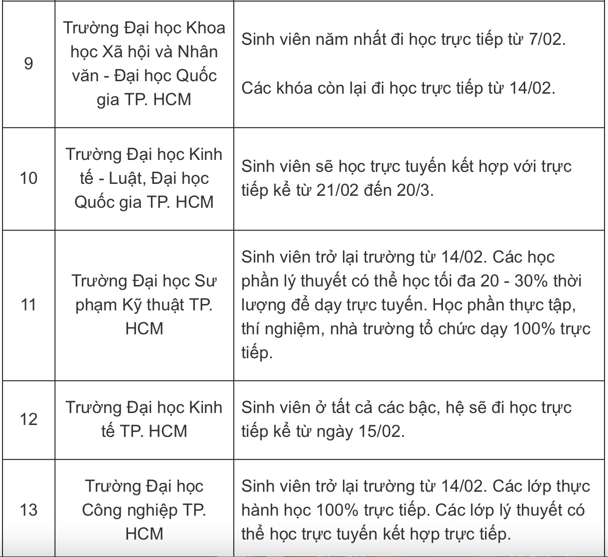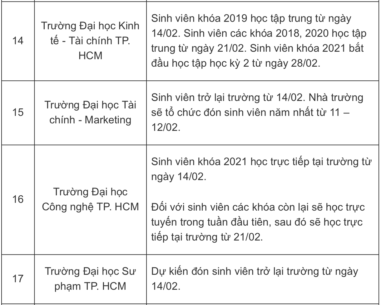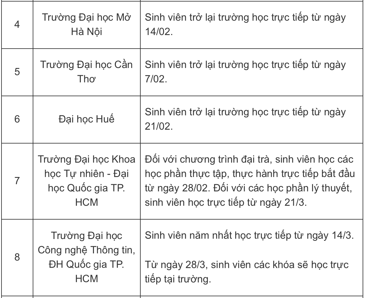 | Lịch trở lại trường học trực tiếp của một số trường Đại học trên cả nước. |