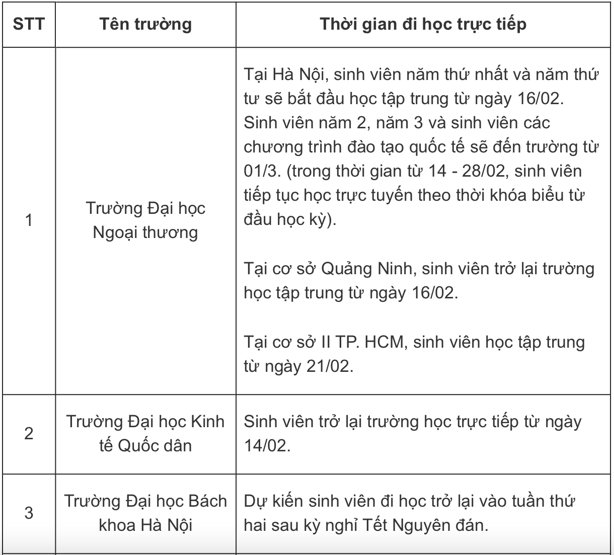 Đến thời điểm này, một số trường Đại học đã công bố lịch đón sinh viên trở lại trường học trực tiếp sau kỳ nghỉ Tết Nguyên đán Nhâm Dần 2022. Trong đó, ở miền Bắc có trường Đại học Bách khoa Hà Nội, Trường Đại học Ngoại thương, trường Đại học Kinh tế quốc dân, trường Đại học Mở Hà Nội...