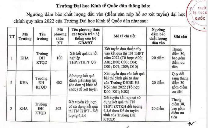 Ngưỡng đảm bảo chất lượng đầu vào Đại học chính quy năm 2022 của trường Đại học Kinh tế Quốc dân áp dụng cho Phương thức xét tuyển mã 100; 402; 502 cụ thể như sau:
