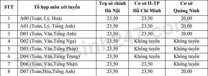 - Đối với điểm thi tốt nghiệp THPT: Đạt mức điểm sàn quy định chung cho cả 9 tổ hợp xét tuyển gồm A00, A01, A02, B00, D01, D07, D26, D28 và D29 là 23 điểm.