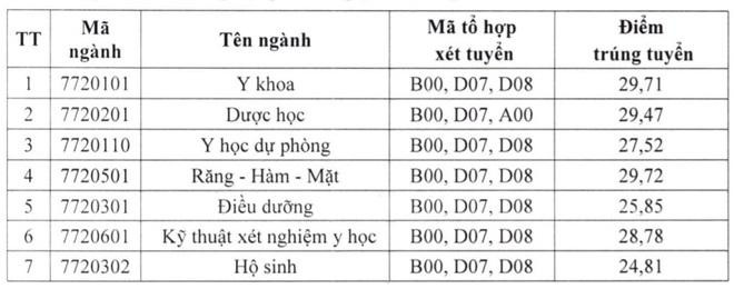 Theo đó, điểm chuẩn đối với phương thức xét học bạ của Trường ĐH Y Dược - ĐH Thái Nguyên năm nay dao động từ 24,81 - 29,72 điểm. Trong đó, hai ngành có điểm chuẩn cao nhất là ngành Y khoa (29,71 điểm) và Răng - Hàm - Mặt (29,72 điểm).