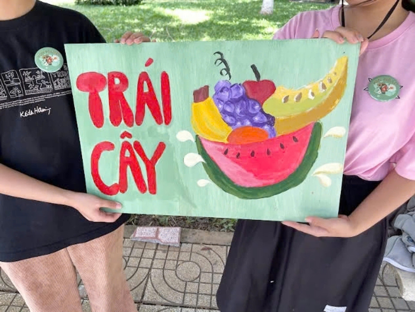 | Tấm bảng mới của xe trái cây dì Sáu (đường Gia Phú, Q. 6) được nhóm “Hướng Dương” vẽ tặng. (Ảnh: Dự án cung cấp) |