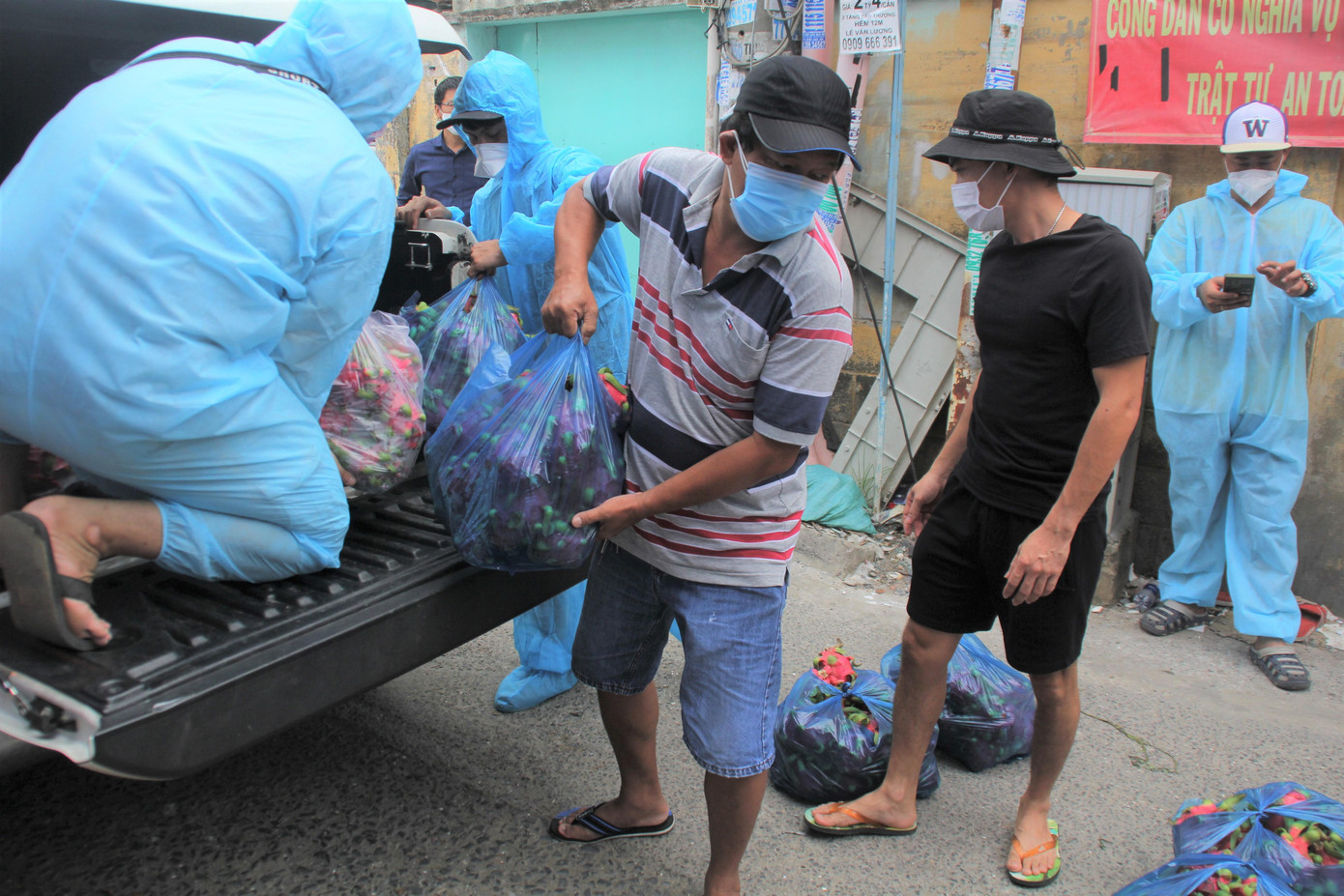 | Các chàng trai giàu lòng nhân ái tiếp tục xuống hàng tại một con hẻm bị phong tỏa nằm trên đường Huỳnh Tấn Phát, phường Tân Phú. Khu vực này tập trung đông bà con lao động tự do, người có hoàn cảnh khó khăn của phường. |