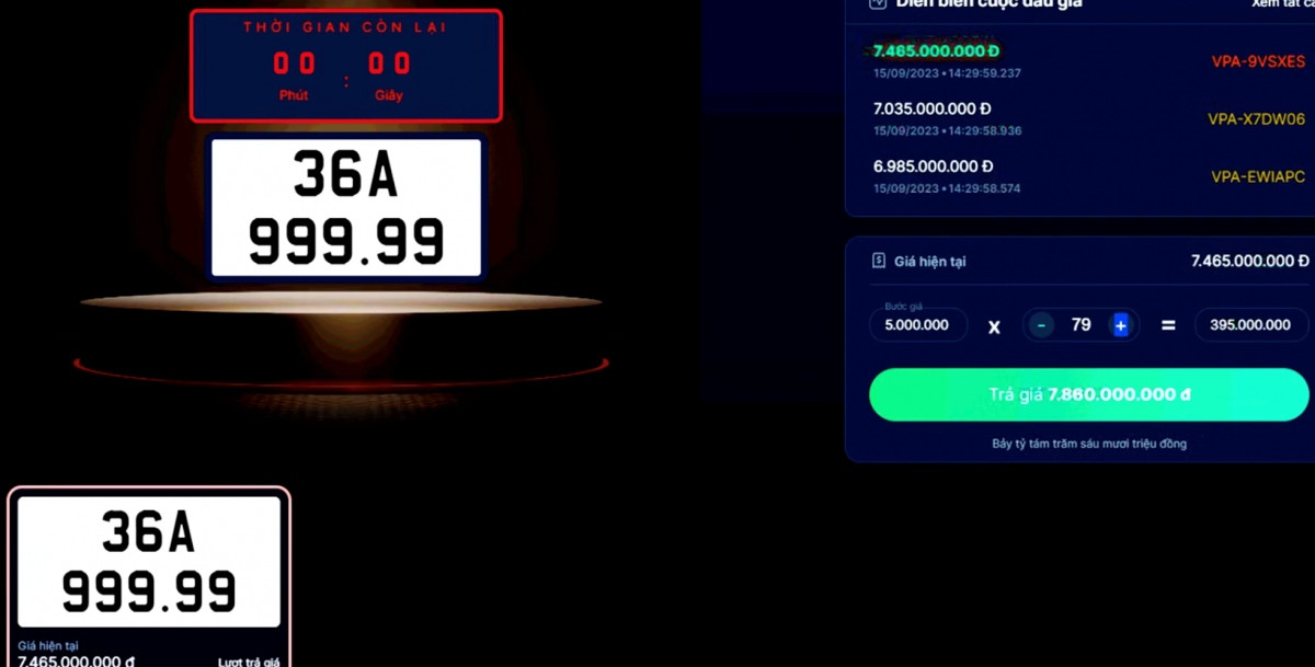 Biển số 36A-999.99 xuất hiện trong khung giờ đấu giá từ 13h30 đến 14h30 ngày 15/9. Trước 7 phút chốt phiên, giá vẫn ở mức 4,3 tỉ đồng, khi thời gian còn 4 phút thì giá của biển số đã đẩy lên 6,3 tỉ đồng và khi thời gian tính bằng giây giá liên tục nhảy từ 6,9 tỉ đồng, 7 tỉ đồng. Cuối cùng, biển số này đạt mức giá 7,470 tỉ đồng.