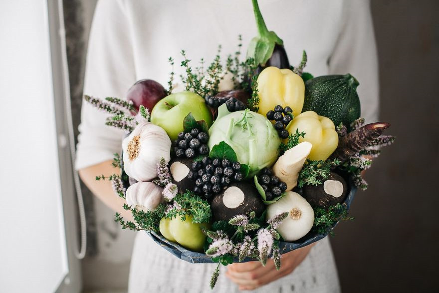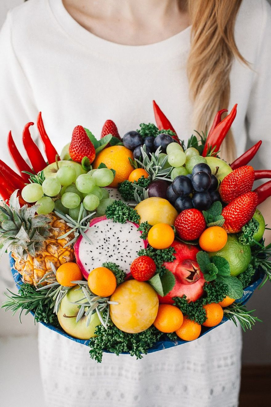 Nếu bạn cảm thấy tiếc và lãng phí khi phải vứt vào sọt rác những lẵng hoa héo, bó hoa làm từ trái cây và rau củ sẽ là lựa chọn hợp lý dành cho bạn. Các loại quả nhiều màu hấp dẫn sẽ tạo nên bó hoa đẹp chẳng kém những bông hoa tươi.