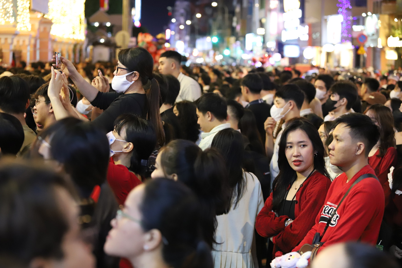 | Tối 24/12, người dân TPHCM và du khách đổ về khu vực trung tâm thành phố để vui chơi, thư giãn nhân dịp Giáng sinh. |