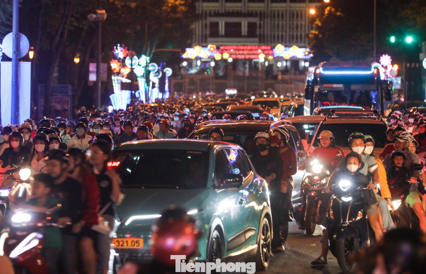 | Theo ghi nhận của Tiền Phong, từ 19 giờ, lượng người đổ về khu vực trung tâm càng đông khiến giao thông ở một số tuyến đường đi lại rất khó khăn. |