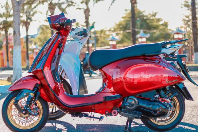 Với hàng loạt các trang bị đến từ thương hiệu nổi tiếng, chủ sở hữu đã hoàn thành bước "lột xác" chiếc xe tay ga một cách xuất sắc. Bề ngoài của xe nổi bật với gói màu "Red Flaker Super Candy”.