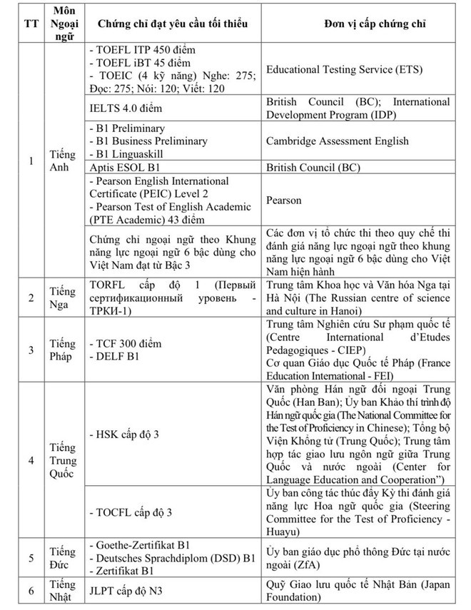 Trong danh sách này, có 7 chứng chỉ tiếng Anh và các chứng chỉ thuộc các ngôn ngữ khác như Đức, Nhật, Pháp, Nga, và Trung Quốc. Đáng chú ý, tiếng Hàn cũng nằm trong nhóm môn Ngoại ngữ, nhưng hiện không có chứng chỉ nào được chấp nhận để xét miễn thi.