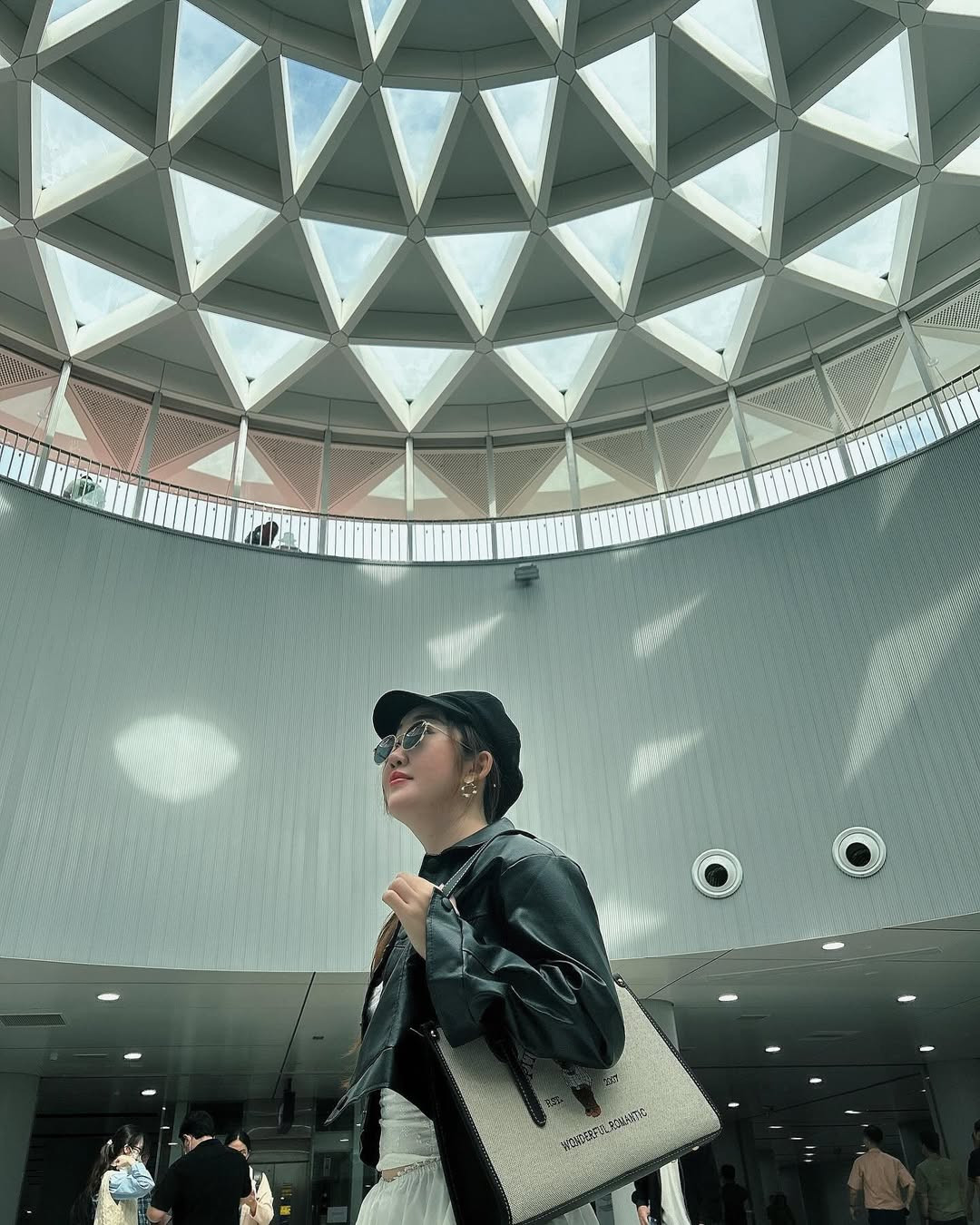 Điểm check-in đầu tiên không thể bỏ lỡ chính là biểu tượng của Metro Bến Thành - giếng trời khổng lồ. Được thiết kế phối cảnh hình hoa sen với chất liệu kính cường lực và nhôm tổ ong, giếng trời không chỉ chiếu sáng một phần nhà ga mà còn là nguồn sáng lung linh cho những bức ảnh.