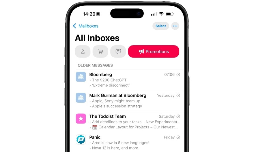 Ứng dụng Mail được cải tiến với hệ thống phân loại thông minh, tự động sắp xếp email thành các danh mục như Chính, Giao dịch, Cập nhật và Khuyến mãi. Điều này giúp người dùng quản lý hộp thư đến hiệu quả hơn.