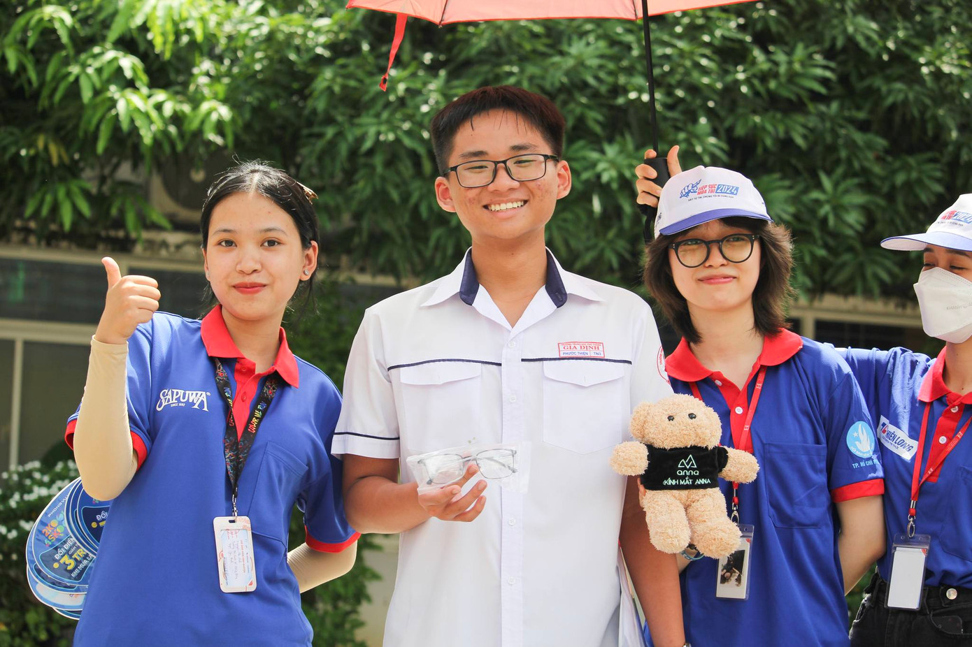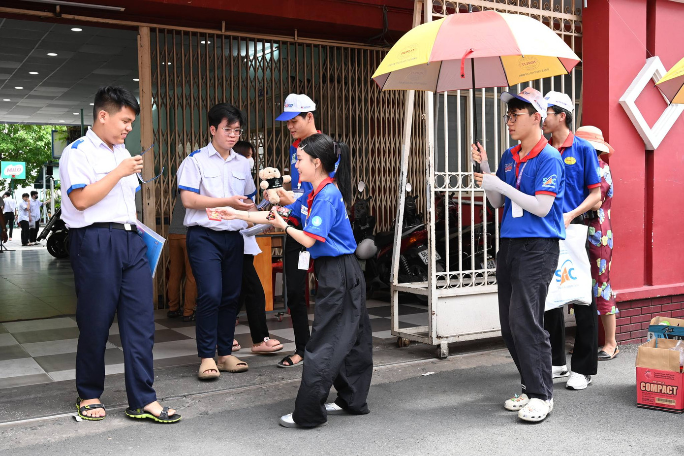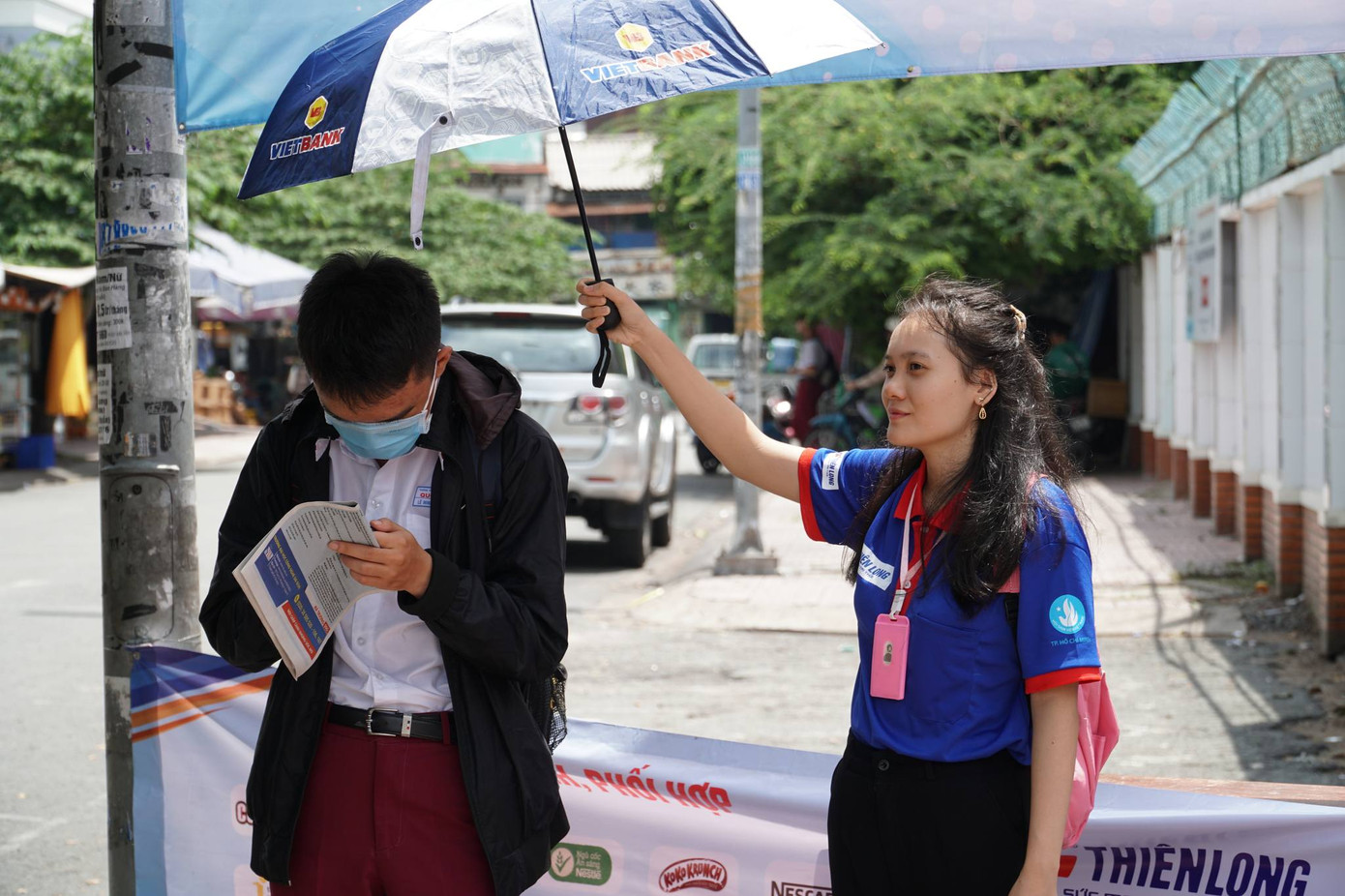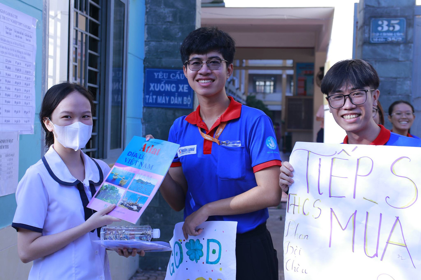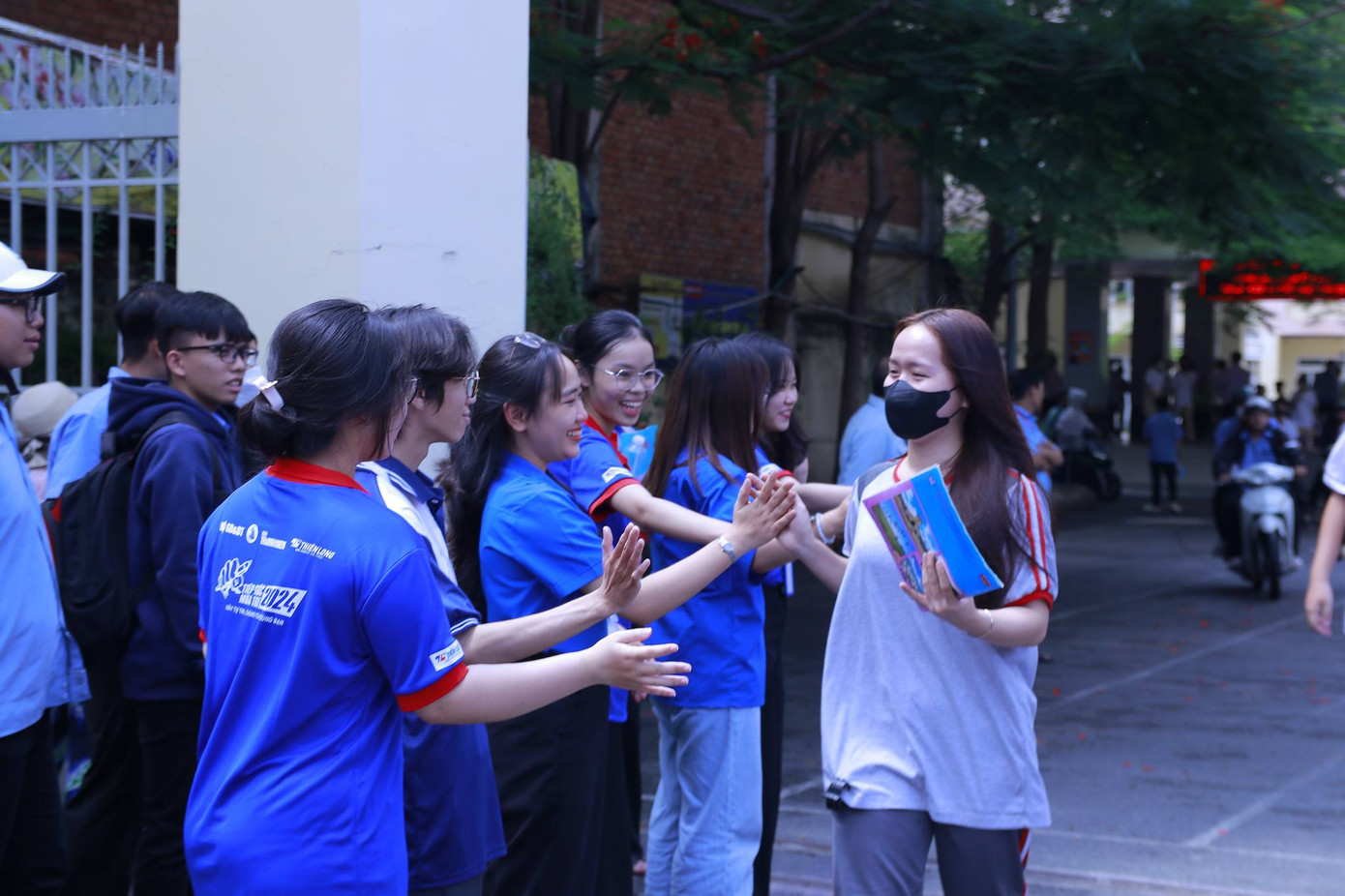 Từ sáng sớm ngày 28/6, nhiều ‘áo xanh tình nguyện’ đã có mặt tại các điểm trường để động viên tinh thần các thí sinh trong ngày thi thứ 2. Ngoài những lời động viên, các bạn sinh viên tình nguyện còn thể hiện những tình cảm qua những cái bắt tay, che ô, hỗ trợ vật dụng... cho thí sinh.