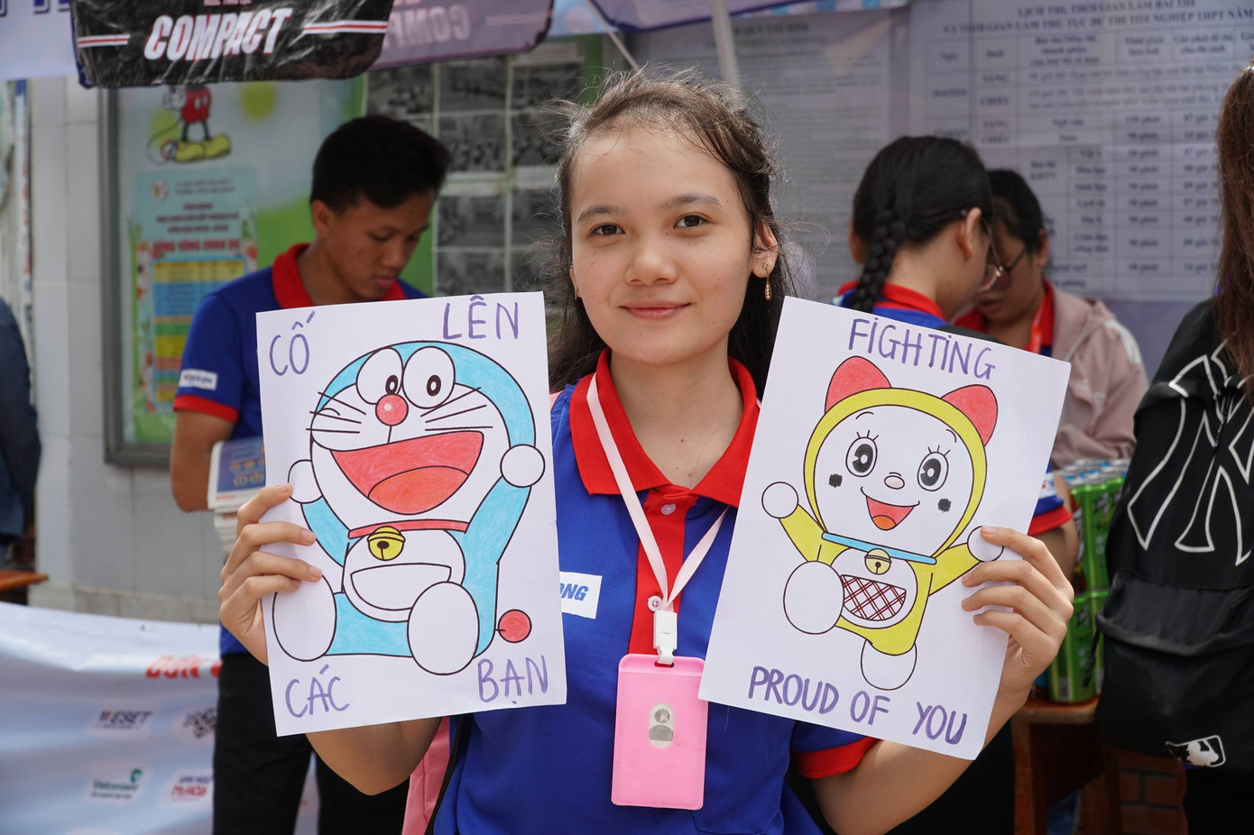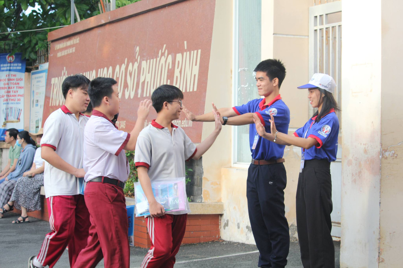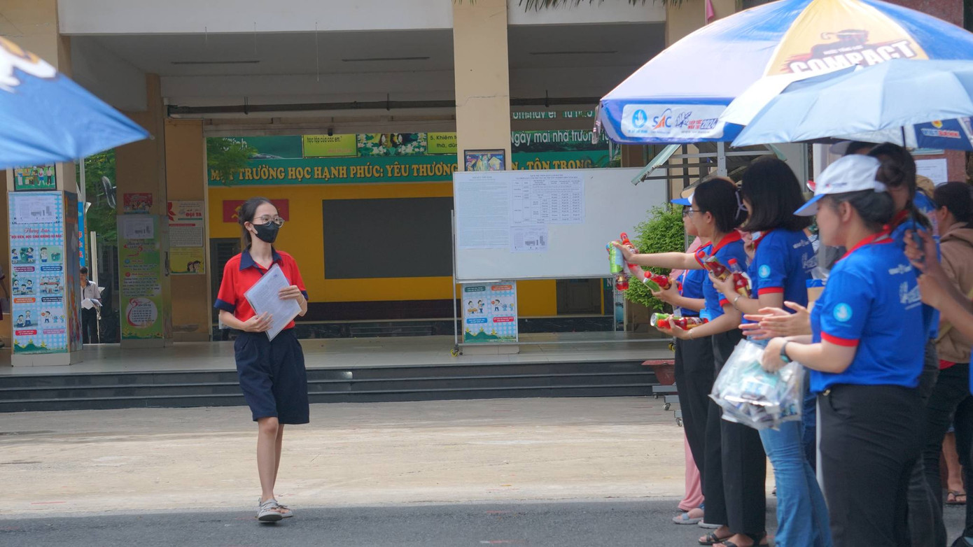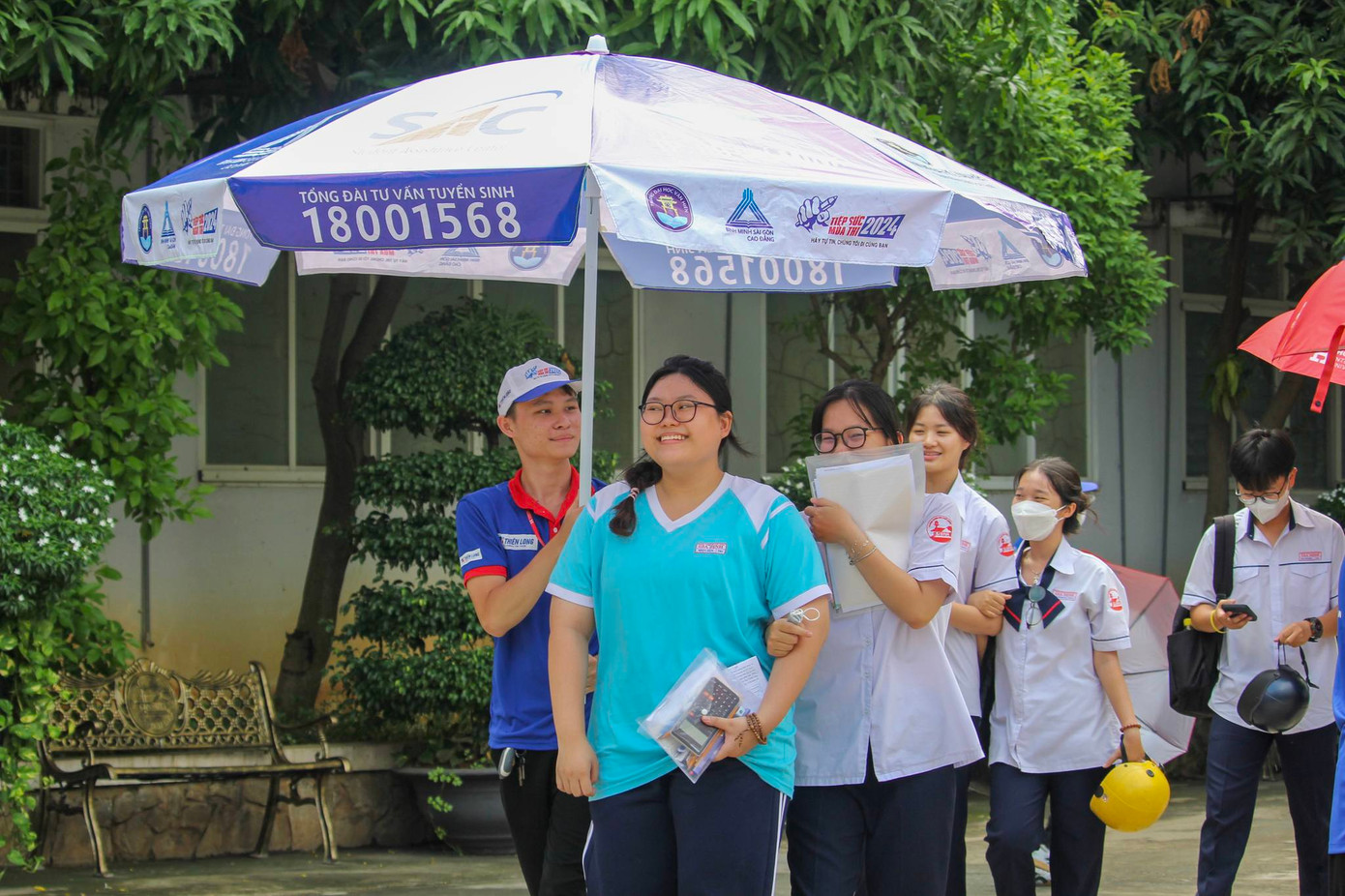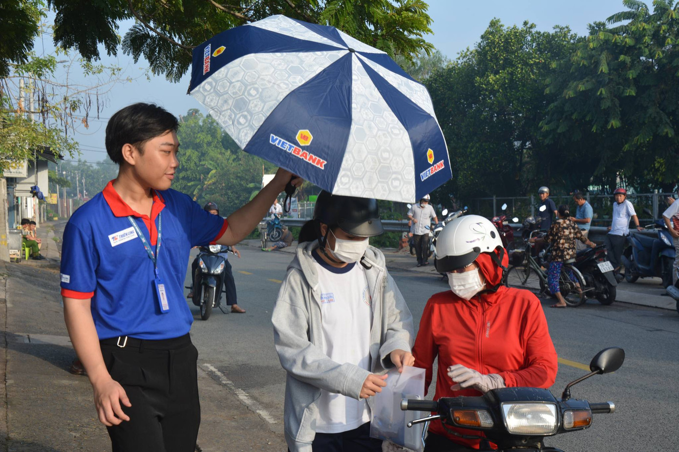 Từ sáng sớm ngày 28/6, nhiều ‘áo xanh tình nguyện’ đã có mặt tại các điểm trường để động viên tinh thần các thí sinh trong ngày thi thứ 2. Ngoài những lời động viên, các bạn sinh viên tình nguyện còn thể hiện những tình cảm qua những cái bắt tay, che ô, hỗ trợ vật dụng... cho thí sinh.