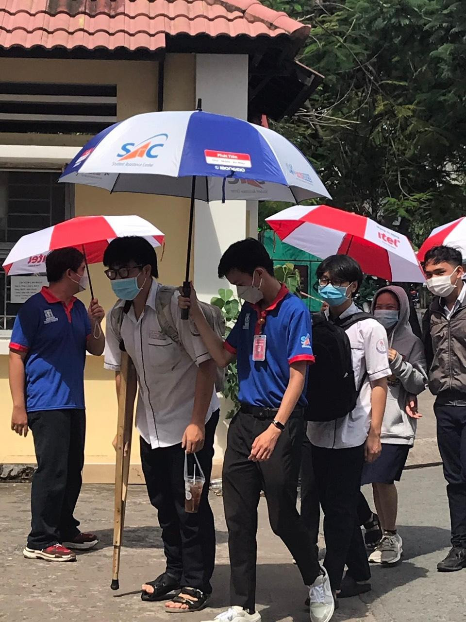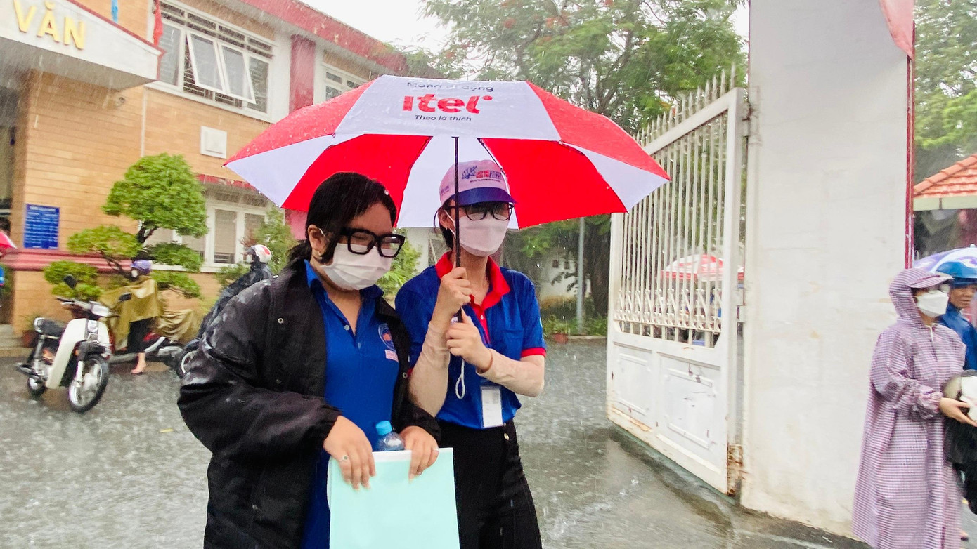 Thời điểm này, các chiến sĩ tình nguyện viên đã không quản ngại mưa gió, che dù đưa thí sinh vào tận phòng thi. Không ít tình nguyện viên người ướt sũng nhưng rất vui khi các sĩ tử vào đến phòng thi an toàn, khô ráo.