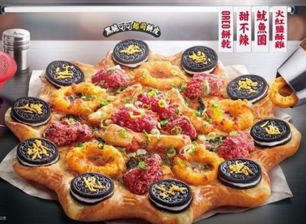 Hai loại nguyên liệu nổi bật trong các món ăn đường phố ở Đài Loan đã được chọn là huyết luộc và trứng bắc thảo. Sau đó, sự kết hợp giữa Oreo, gà viên chiên và mực cũng trở thành cảm hứng cho món bánh pizza mới.